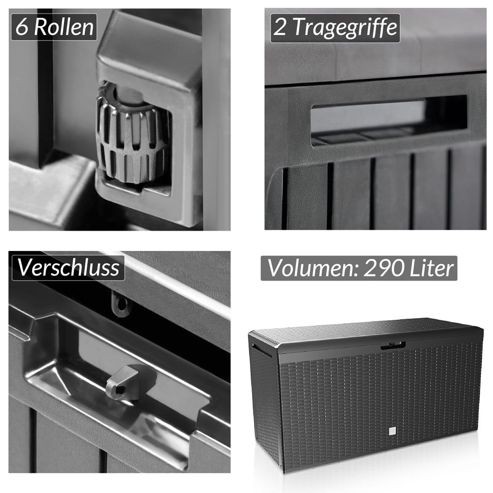 Vejr- og UV-bestandig opbevaringsboks med en volumen på 290 liter giver plads nok til dine haveartikler. Den leveres med 6 hjul , en lukkeanordning ved låget og laterale bærehåndtag.