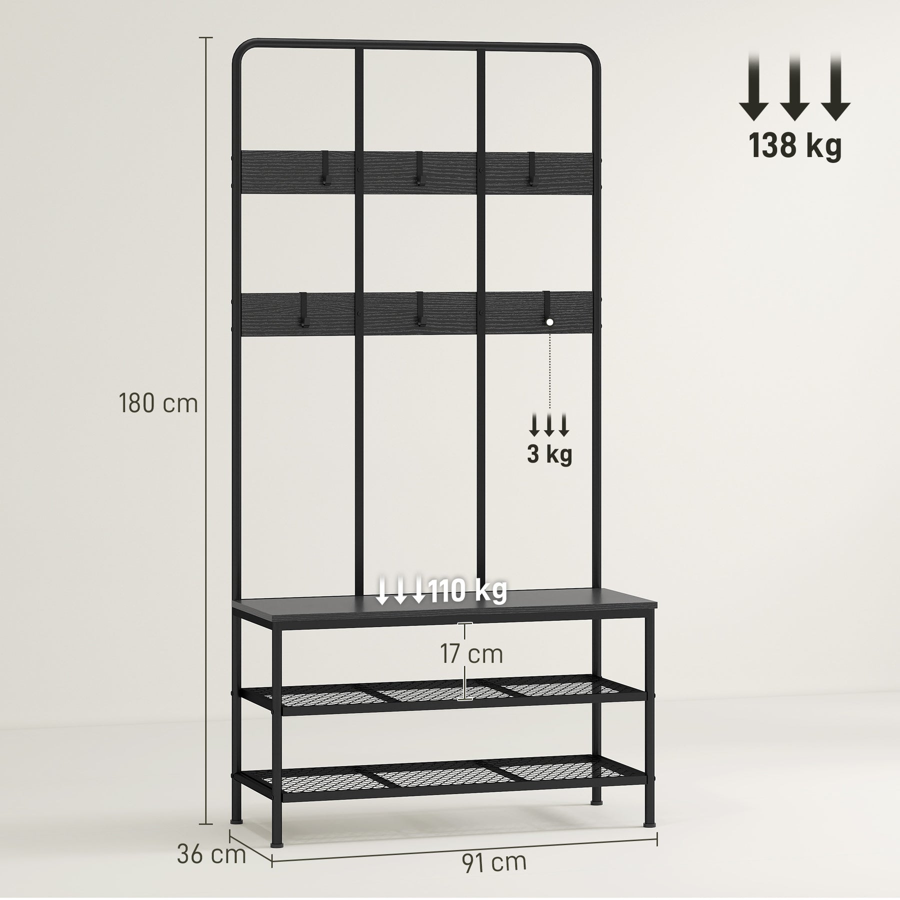 Gør din entré til et stilfuldt og funktionelt rum med denne 3-i-1-hylde. Efter en lang dag kan du nemt hænge din frakke og taske på de robuste dobbeltkroge, mens du slapper af på den komfortable bænk, der er perfekt til at tage skoene af. Med to ventilerede nethylder til opbevaring forbliver dine sko pæne og rene.