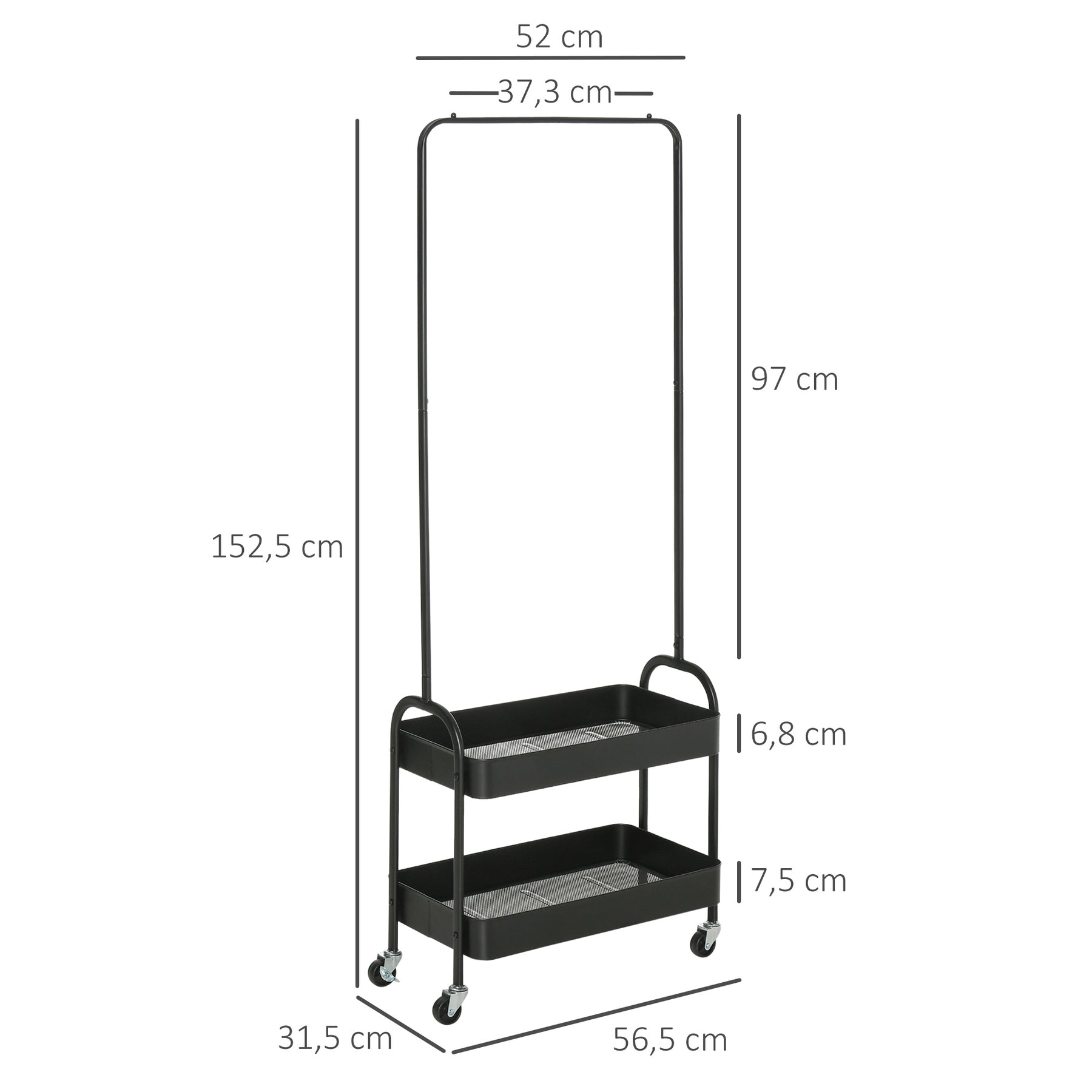 Optimer pladsudnyttelsen med dette mobile tøjstativ, der er perfekt til trange rum som gange eller garderober. Den robuste stålramme sikrer, at frakker, jakker og andre beklædningsgenstande holdes sikkert. To nederste hylder giver praktisk opbevaring til sko og tasker, og de letløbende hjul gør det nemt at flytte stativet.