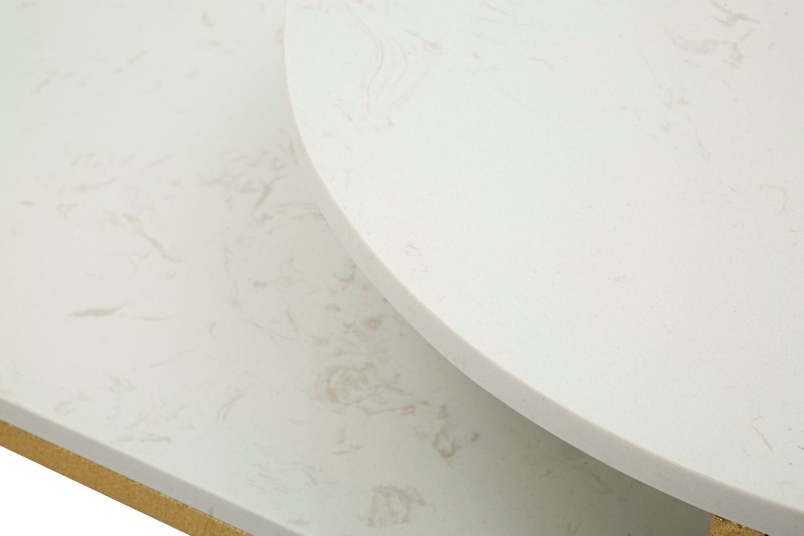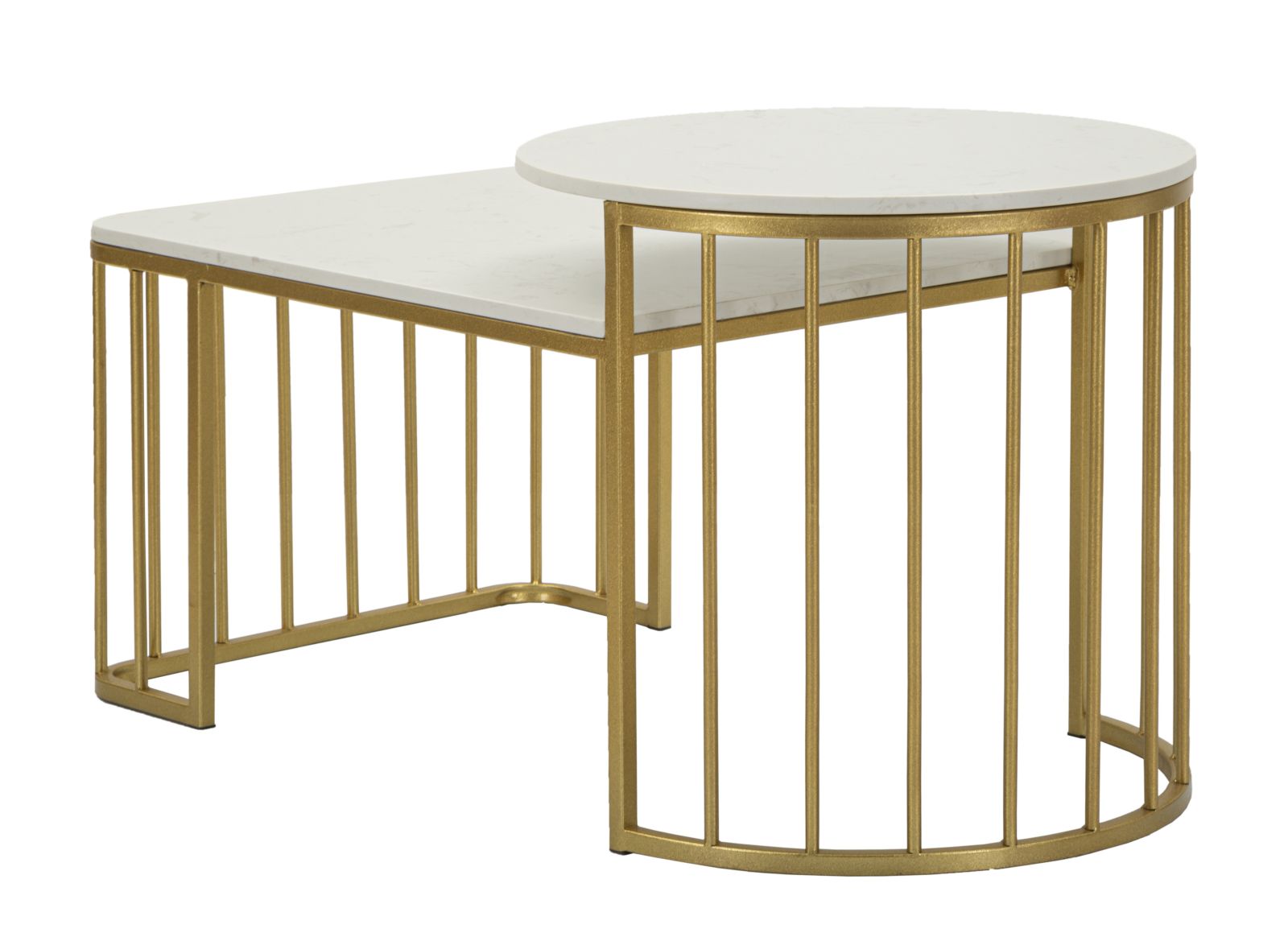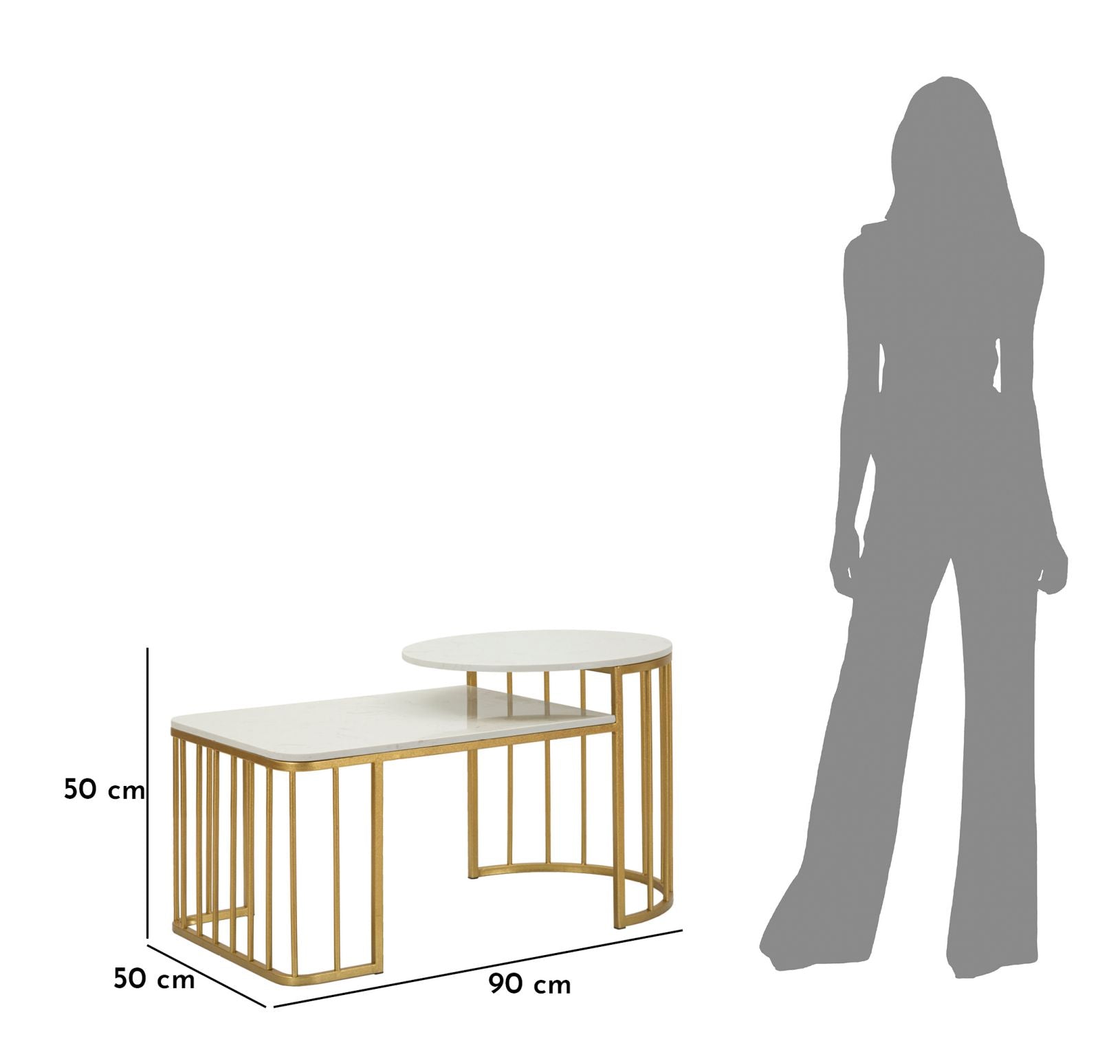 Med sine originale linjer og smukke guldstruktur med en bordplade med marmor-effekt er dette sofabord et ideelt valg til at tilføje stil til enhver moderne stue. Den gyldne farve giver et luksuriøst og eksklusivt touch, der skaber et varmt og indbydende miljø.