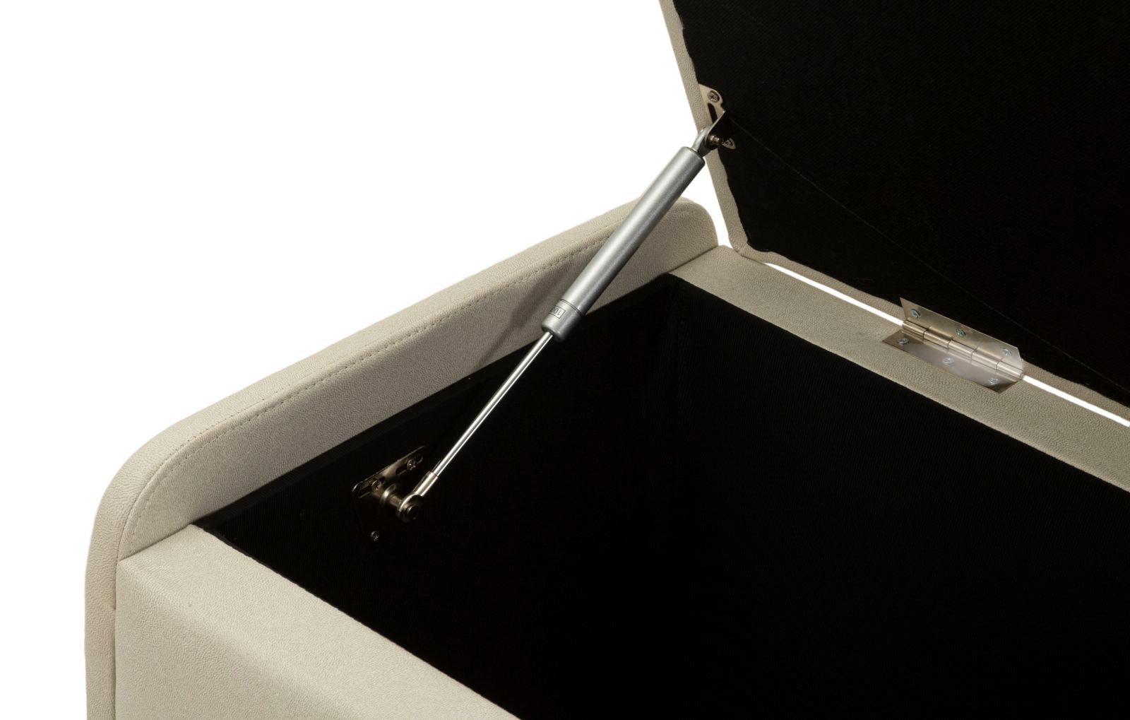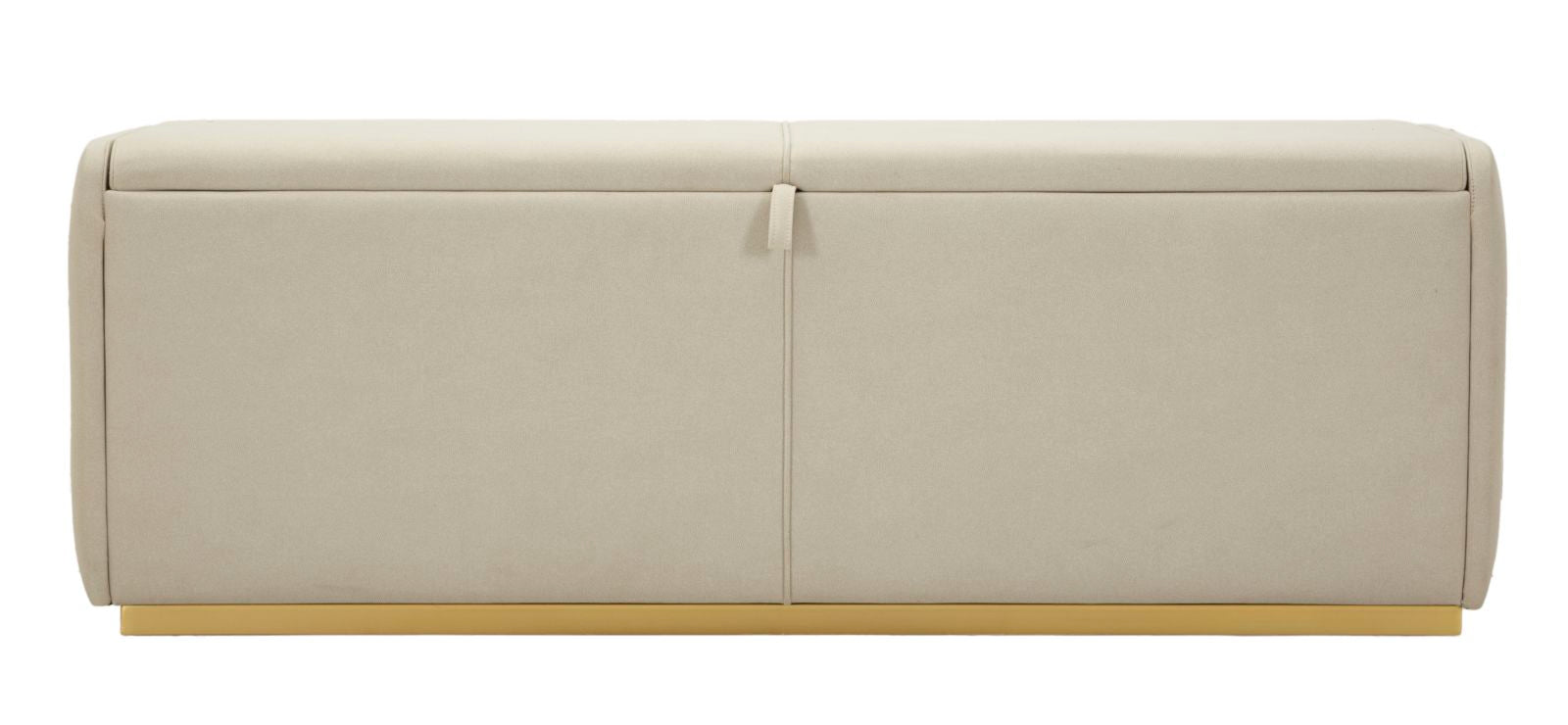 Med et praktisk, polstret sæde og et smart opbevaringsrum er bænken både dekorativ og funktionel. Den er beklædt med et elegant finish i lædereffekt og står på en smuk guldfarvet metalbase, som giver et stilfuldt og eksklusivt udtryk.