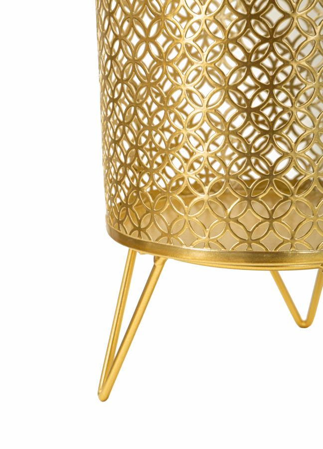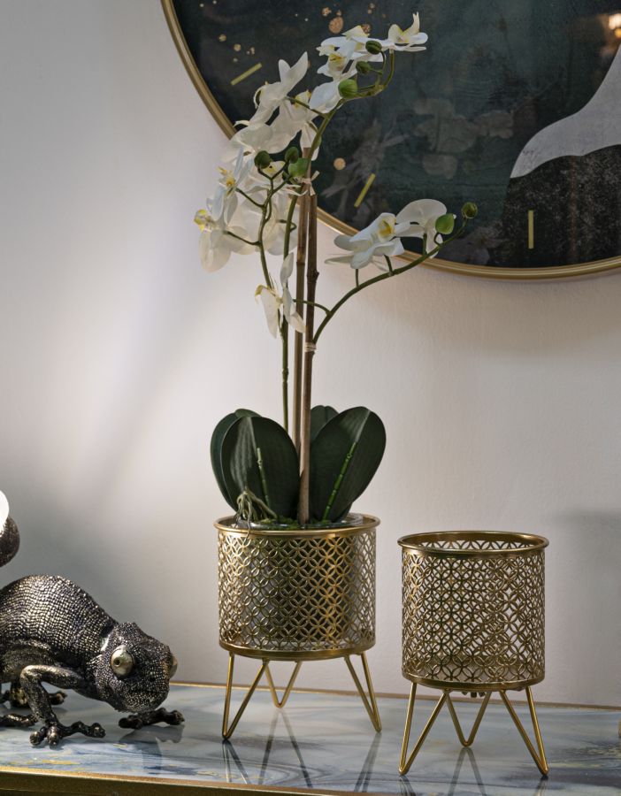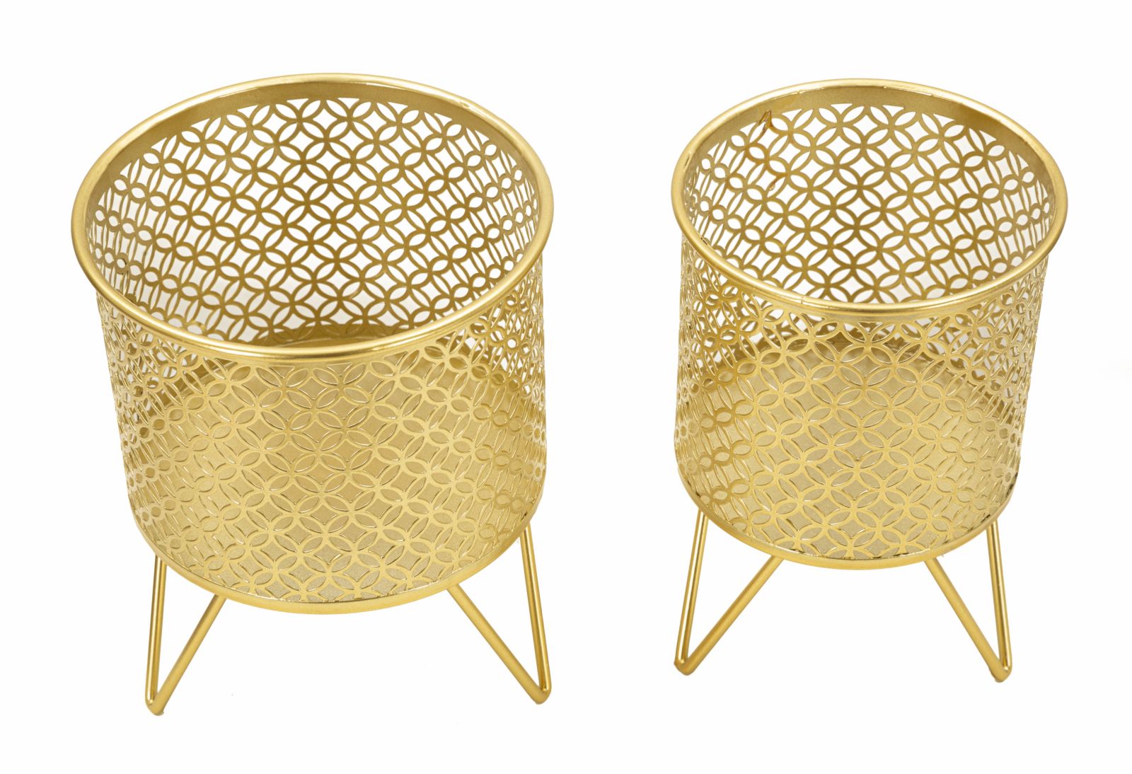 Vasernes elegante udskæringer af krydsende, runde former skaber et unikt og iøjnefaldende design. I kombination med den gyldne farve giver det stellet et sofistikeret udseende. Vaserne kan nemt tages ud af deres matchende guldstativer, hvilket giver dig frihed til at placere og arrangere dem, som du ønsker.