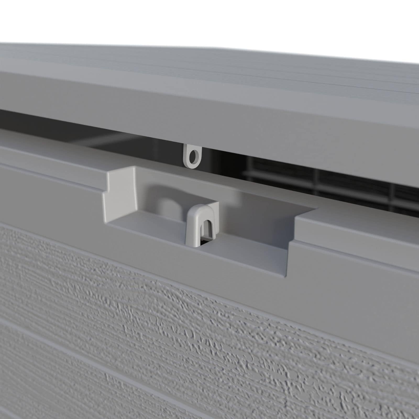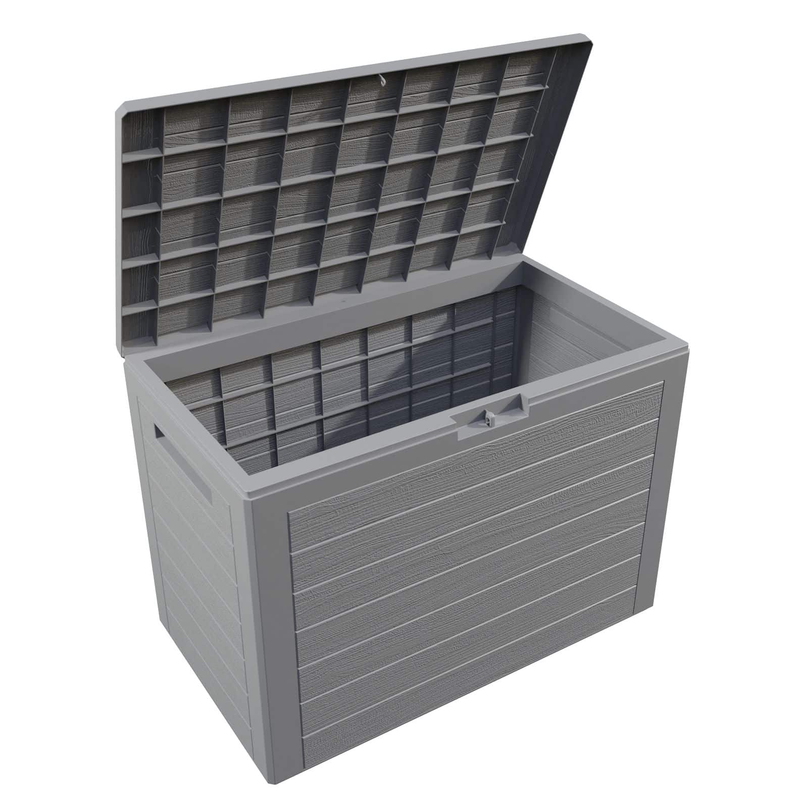Pudeboksen "Lille" af plast med trælook giver plads til sædebetræk, hynder og andet havetilbehør. Det hængslede låg med låseanordning kan åbnes og lukkes. Kassen er desuden udstyret med forsænkede greb i siden.