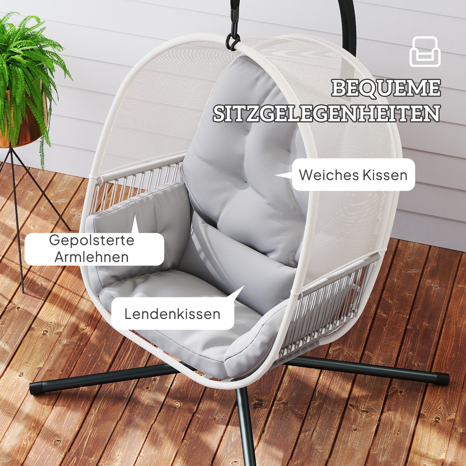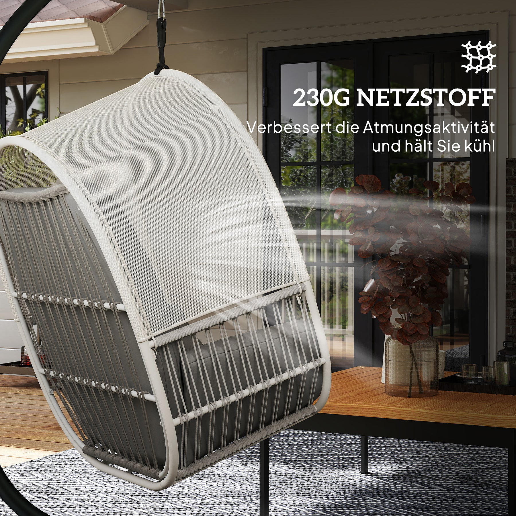 Oplev ren afslapning med denne hængestol – et frisk pust til ethvert miljø. Den er lavet af luftigt meshstof og tilbyder hynder samt en aftagelig lændehynde, der tilpasser sig perfekt til din krop. Takket være den robuste, pulverlakerede stålramme og de afbalancerede "X"-ben er en sikker gyngeoplevelse garanteret, perfekt til din udendørs eller indendørs oase.