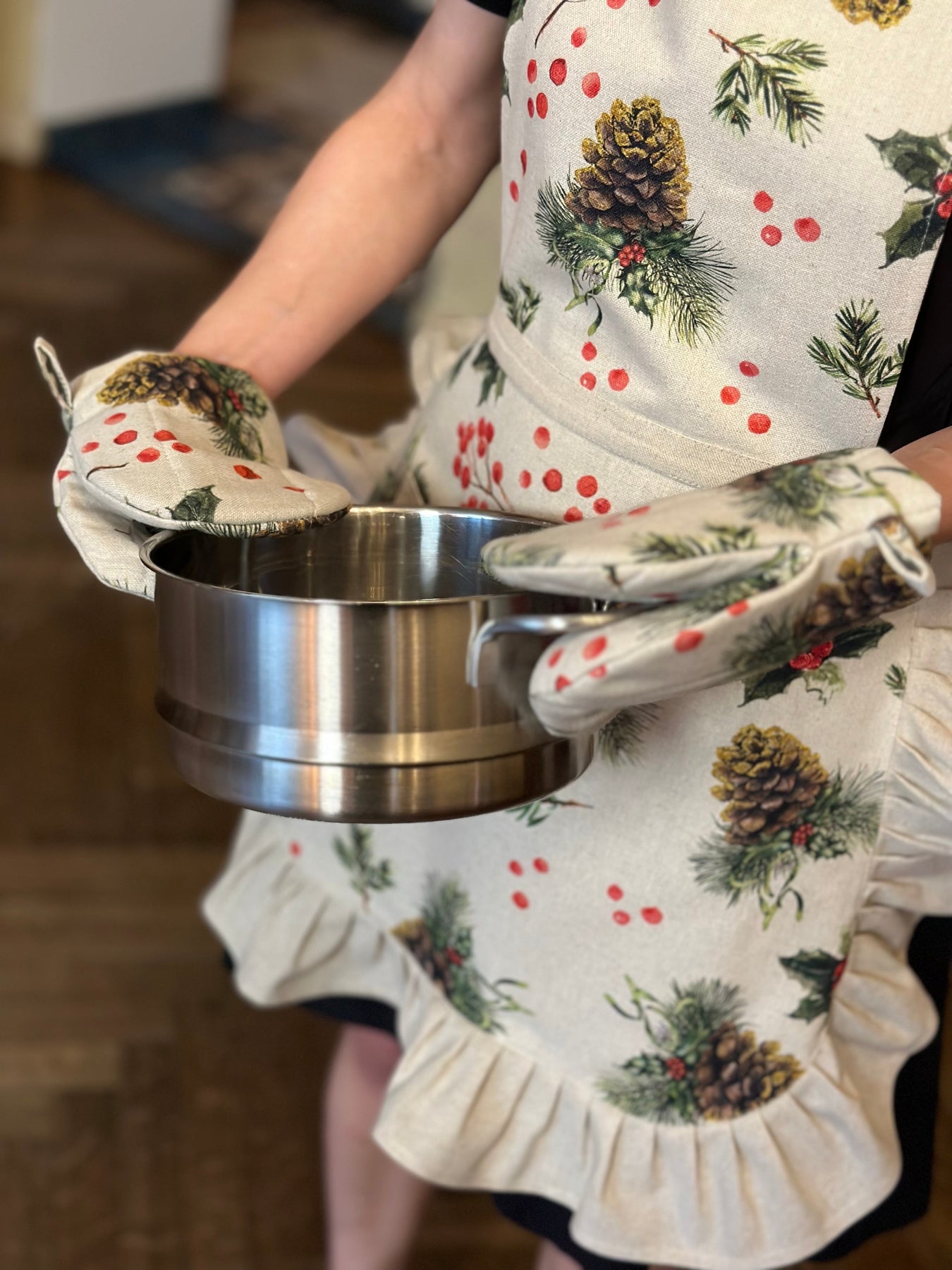 Komfortabel grydeluffe med et attraktivt design, der er varmebestandig. Det dobbelte uldfyld beskytter hænderne mod forbrændinger. Bring en festlig stemning til din daglige madlavning, især når du bærer matchende forklæder fra vores kollektion. Et pragtfuldt sæt tøj til husmoderen, så hun kan føle sig som en klassisk kok i køkkenet!