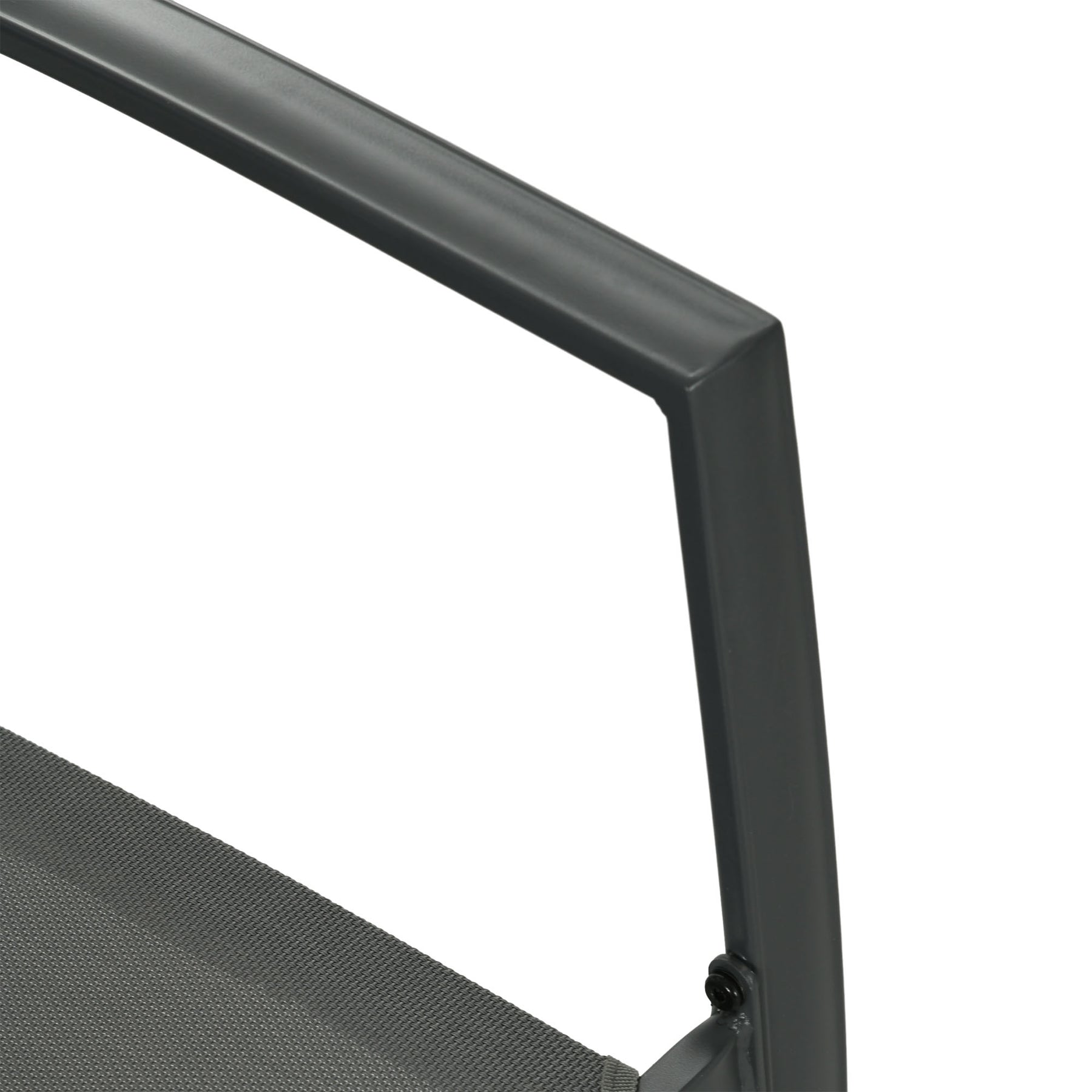 Stolene har en robust stålramme, og det rektangulære bord er designet til at klare enhver aktivitet. Med sit elegante design passer det perfekt ind i haven, på terrassen eller ved poolen.