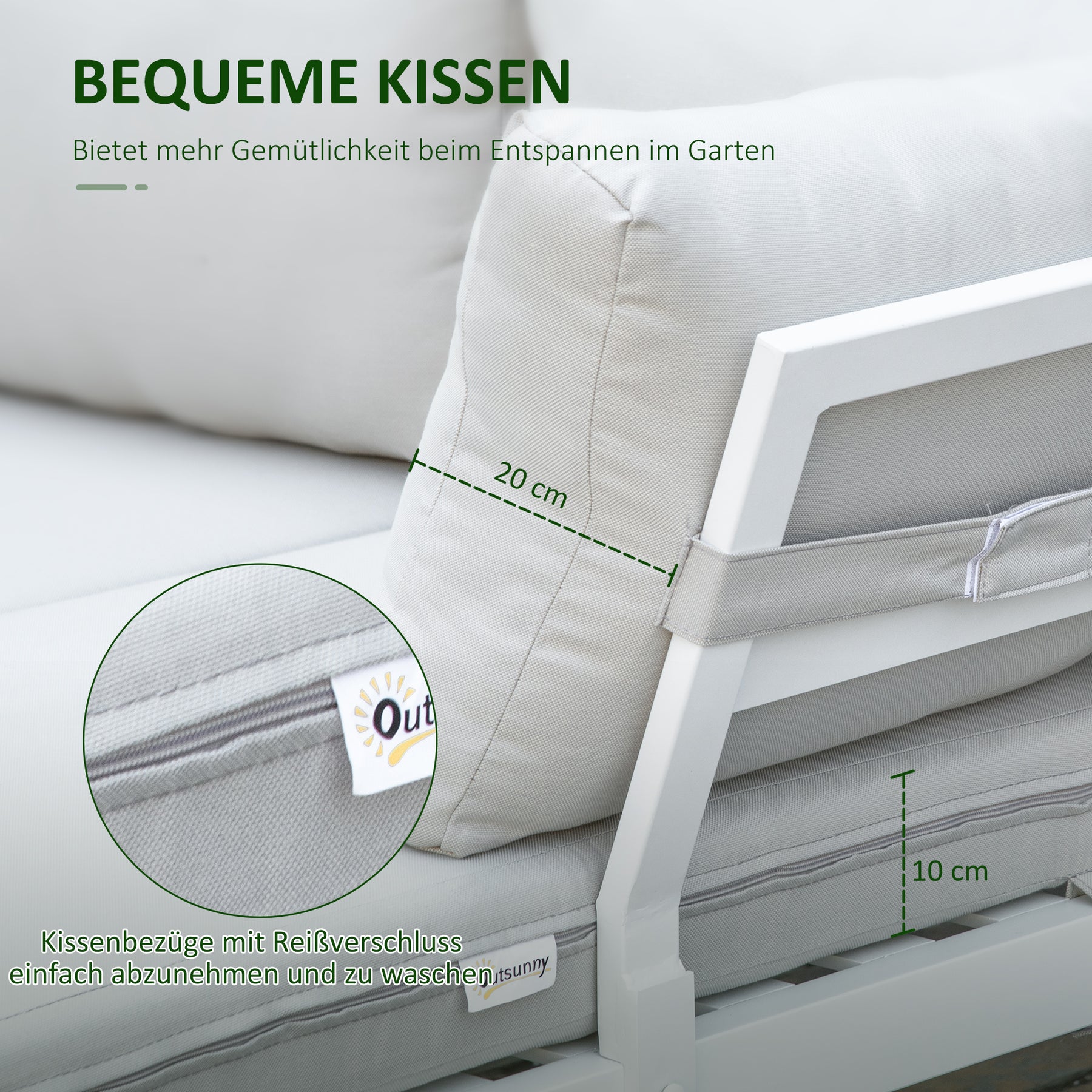 Glem alt om begrænsede siddepladser i dit udendørsområde! Dette 3-delte møbelsæt giver dig en sofa, en chaiselong og et sofabord, hvilket skaber masser af plads til hyggelige samtaler med dine gæster. Det holdbare aluminiumsstel sikrer, at sættet kan modstå vejrets udfordringer og forblive stilfuldt i lang tid.