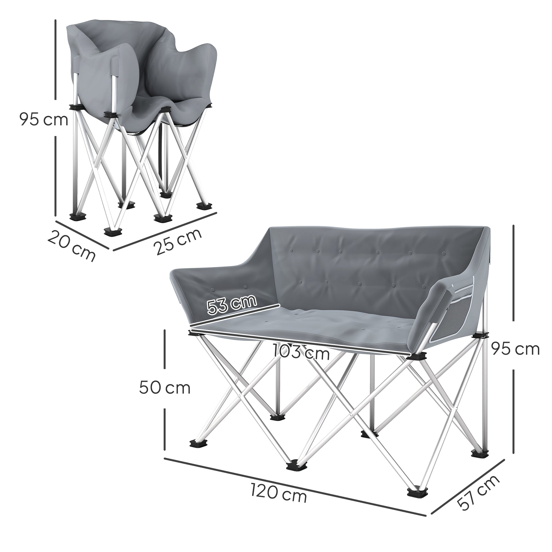 Oplev den komfortable foldbare campingstol, der er designet til to personer. Med en robust ramme og stænkbeskyttende stof er denne lette stol perfekt til alle udendørs aktiviteter. Sidelommerne giver nem adgang til dine vigtigste ejendele, hvilket gør den til den ideelle ledsager på dine eventyr.