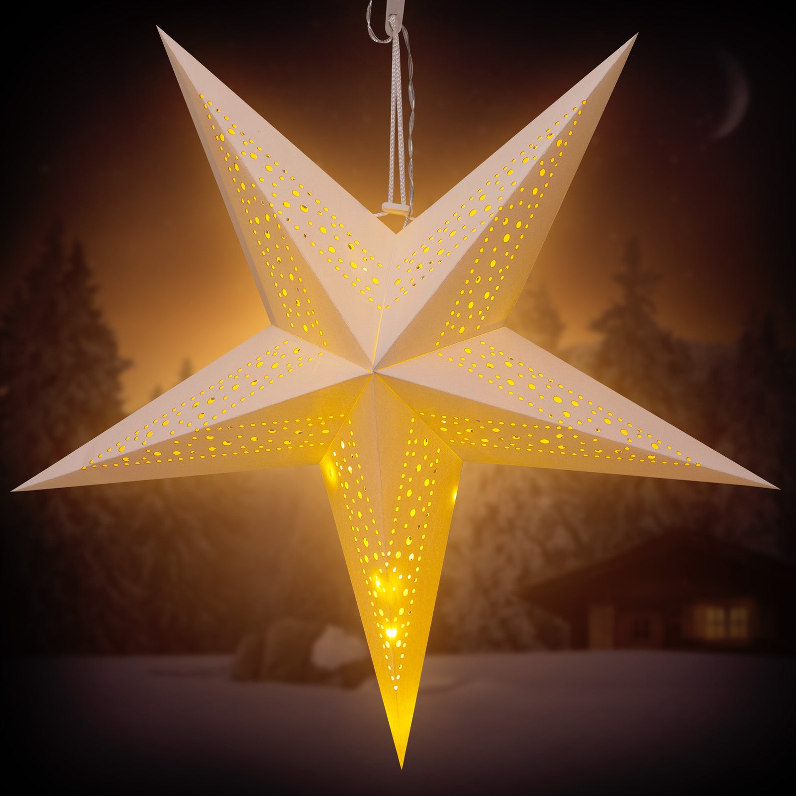 De 60 cm store, foldbare julestjerner fra Casaria®  giver en skøn og fortryllende stemning ved juletid. 10 varmhvide LED'er skaber en festlig stemning. De batteridrevne  LED-papirstjerner kan hænges hvor som helst (f.eks. i et vindue eller på en dør), da der ikke kræves en stikkontakt.
