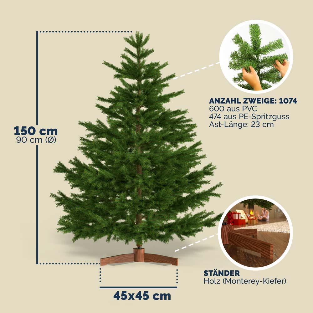 Vores kunstige juletræ er designet til at ligne et ægte juletræ på alle måder. De tætte, mørkegrønne nåle er formet som naturlige nåle og giver træet en utrolig realistisk fylde. Med sine 550 grene kan du selv forme træet, så det passer perfekt til din indretning.