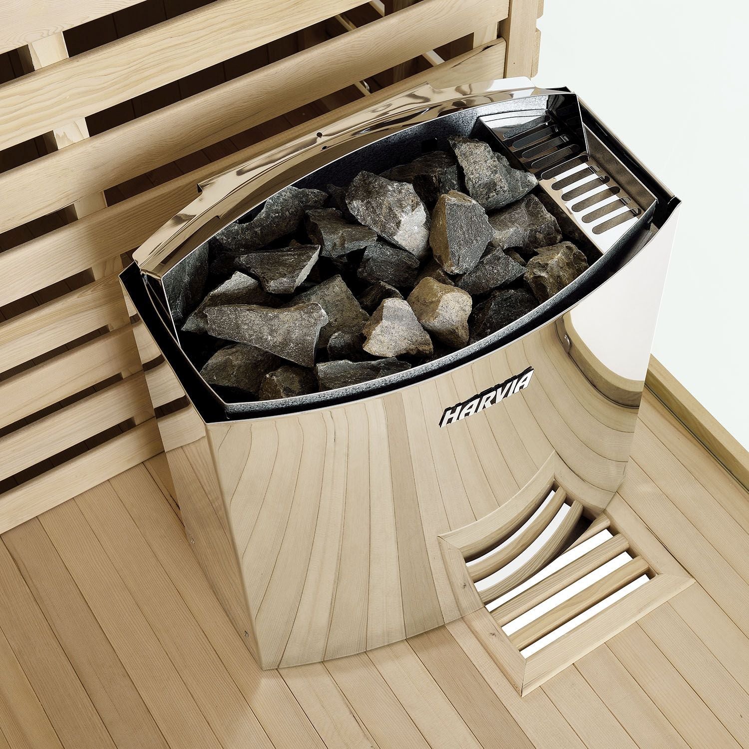 • Effektiv Varme: Den moderne saunaovn fra den finske producent Harvia sørger med sine 8 kW for en velgørende varme. Ovnen styres nemt med to betjeningsknapper. Det elegante yderkabinettet i rustfrit stål med trælister giver saunaen et stilfuldt design.
