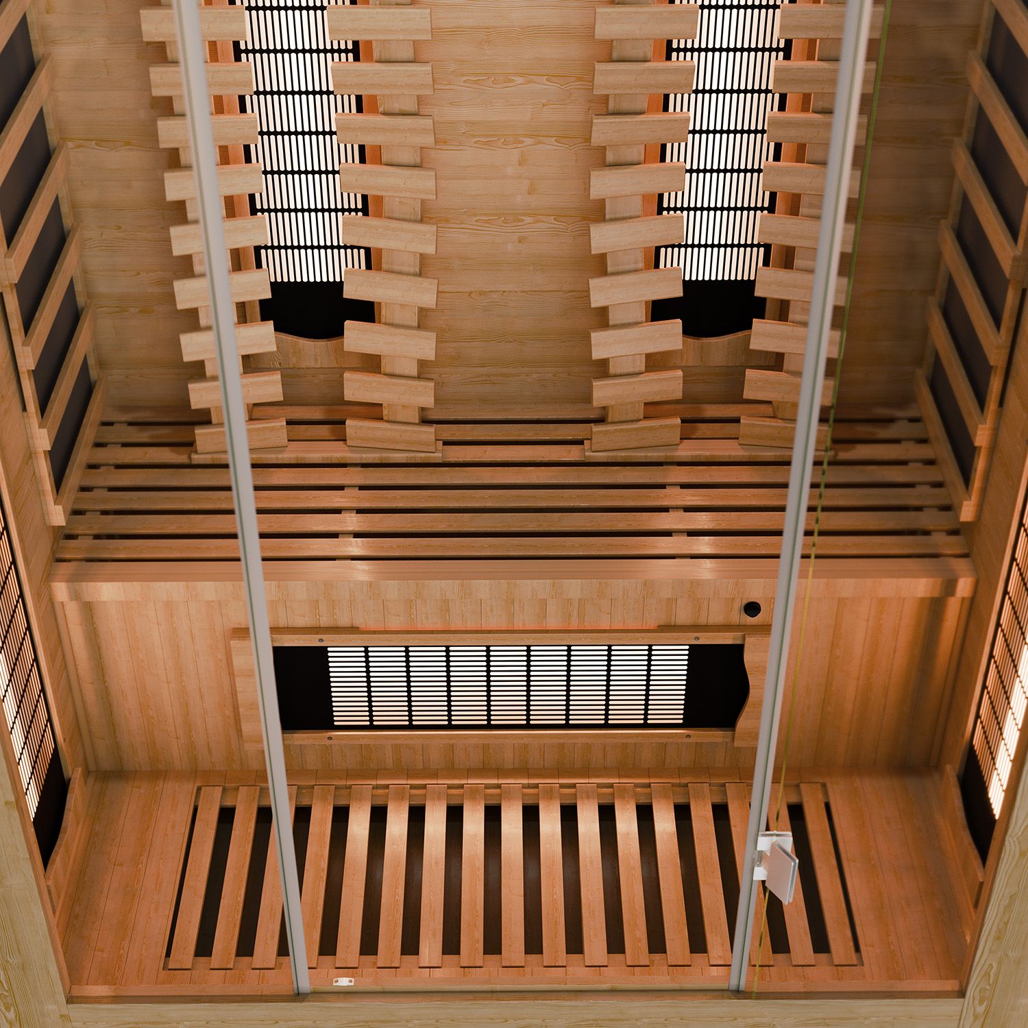 Infrarødkabine Kiruna130 Premium med Dual-Teknologi forvandler dit hjem til en privat wellness-oase. Kombinationen af intense fuld spektrum- og overfladestråler skaber en optimal velvære-følelse. Udstyret med lydsystem, farvelys og et digitalt betjeningspanel tilbyder den jer den absolut højeste komfort.