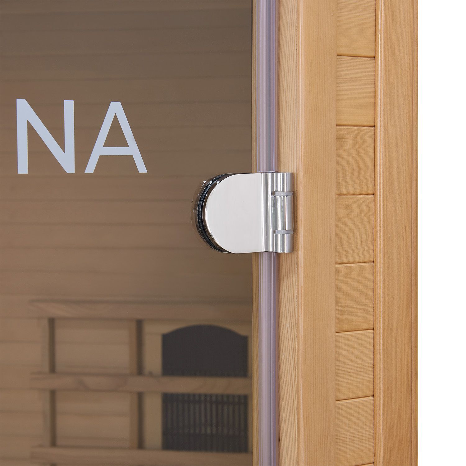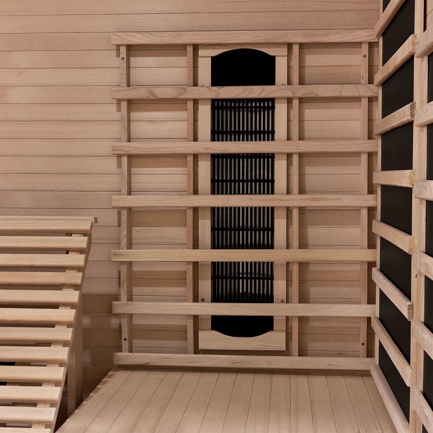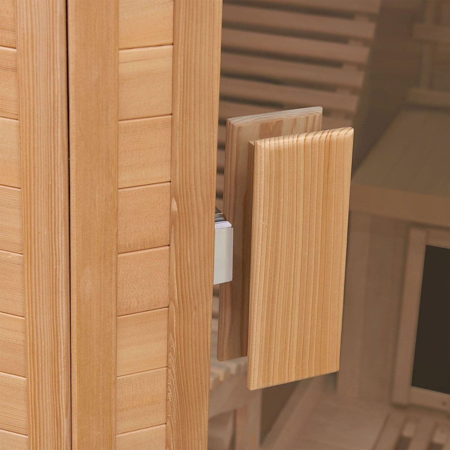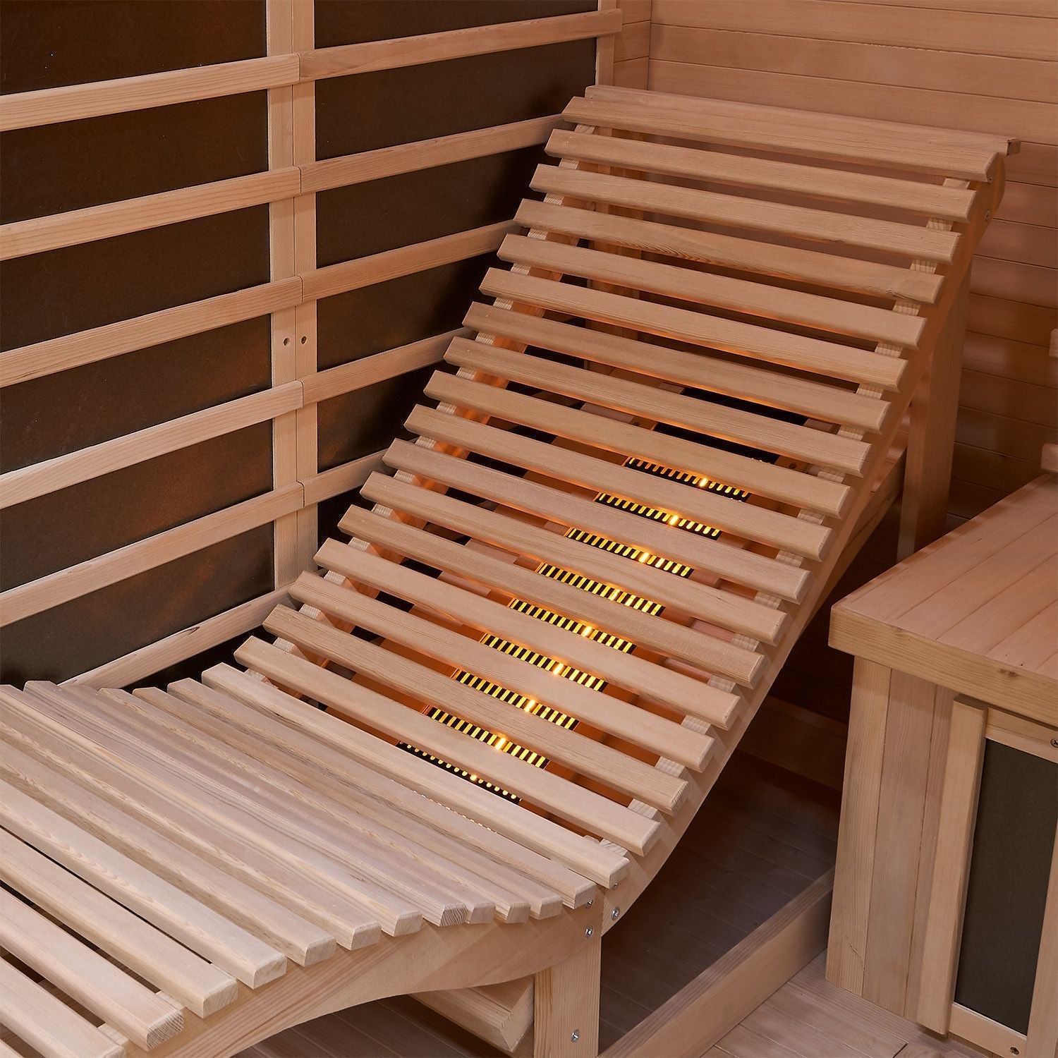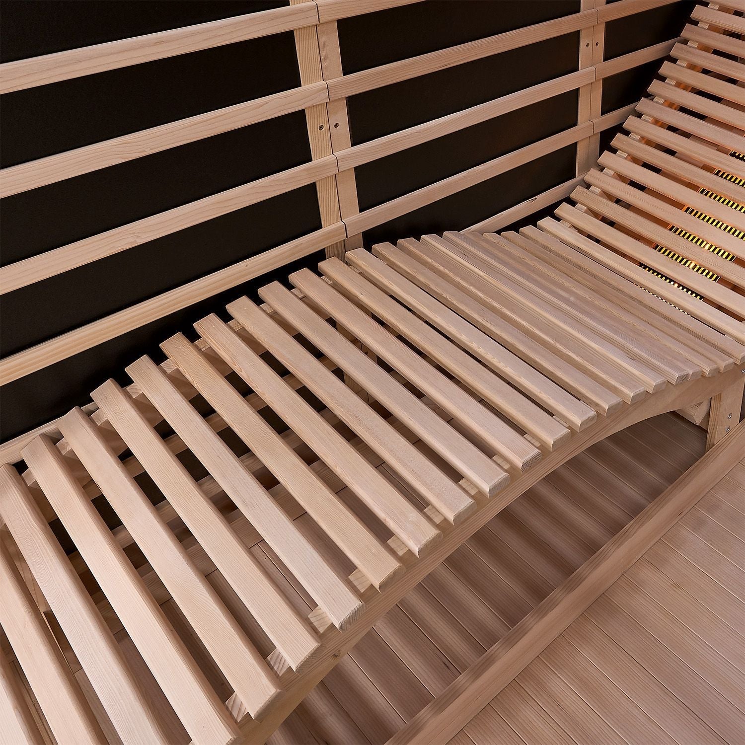 Ideelt Rumklima: Vi bruger det lyse træ fra Hemlock-gran til vores infrarødkabiner. Den specielle træsort reflekterer den varme infrarødstråling og holder den inde i kabinen. Sammen med granens vandafvisende egenskab skaber dette et behageligt rumklima.