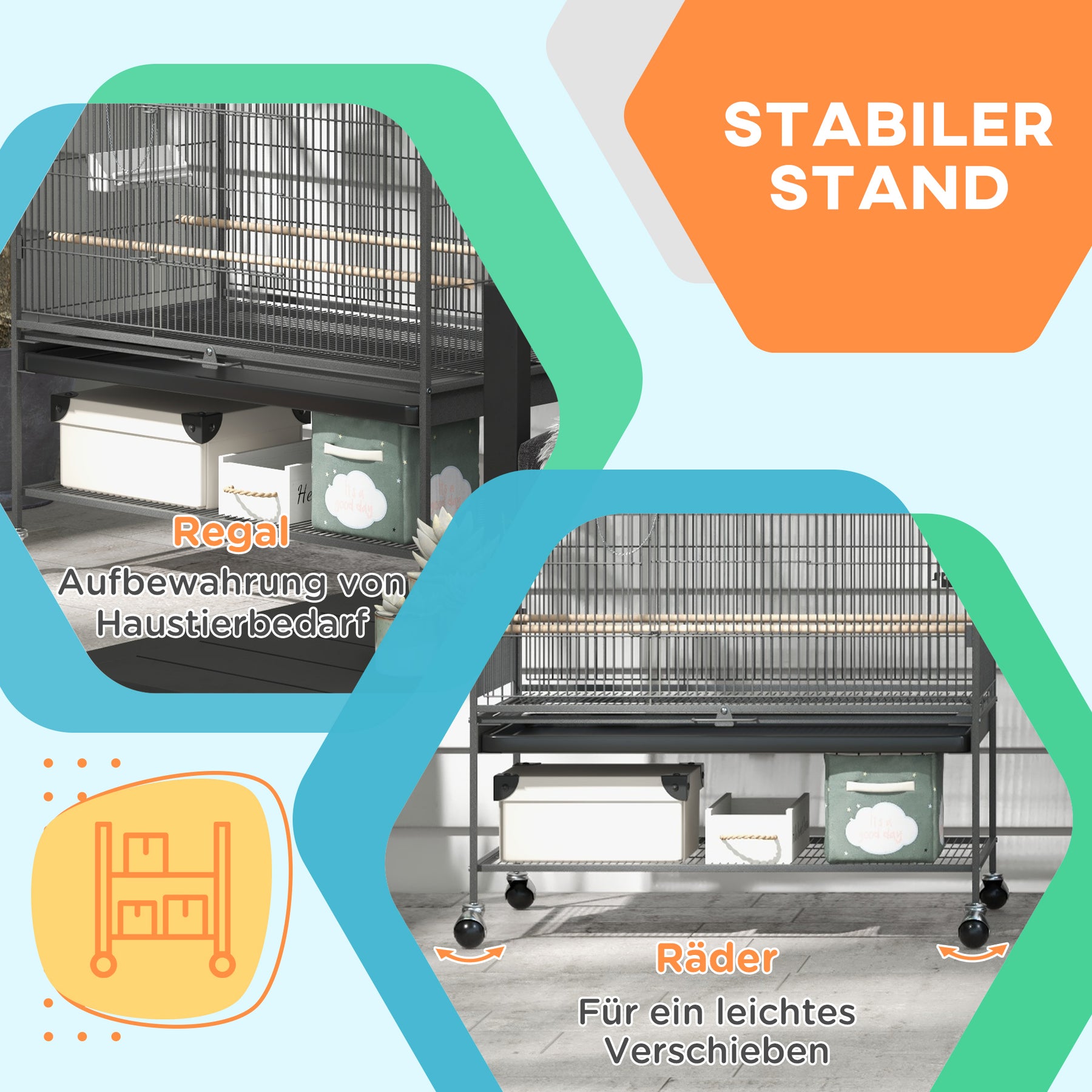 Rengøringen er hurtig takket være den aftagelige bundbakke, og buret er udstyret med hjul for nem flytning, hvoraf to har låsebremser for ekstra sikkerhed.