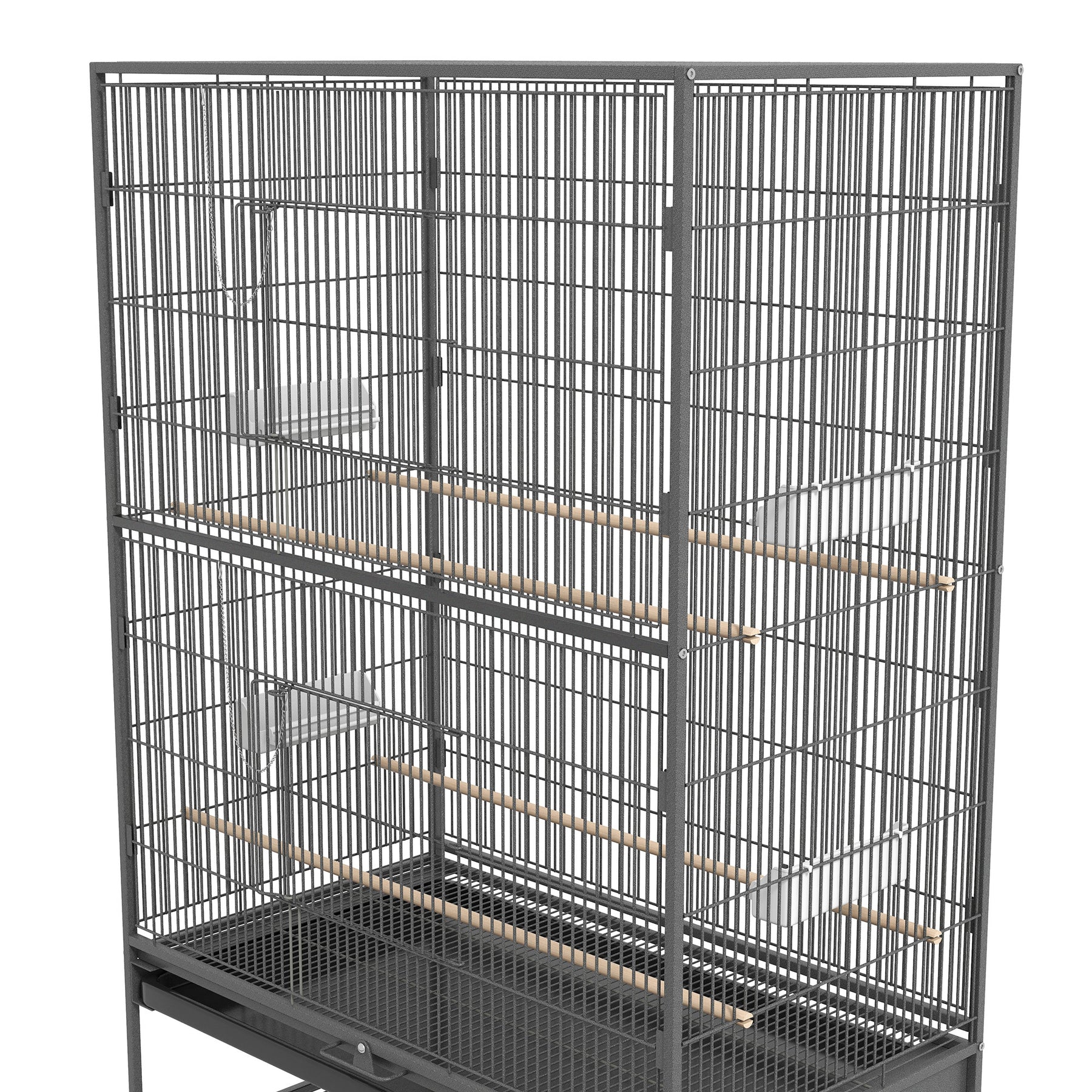 Har du brug for et rummeligt sted, hvor dine fugle kan føle sig trygge? Dette fuglebur er løsningen. Det giver masser af plads til, at fuglene kan strække deres vinger og hvile på de mange siddepladser. Flere døre letter adgangen til buret, mens aftagelige vand- og madskåle forbedrer fodringen.