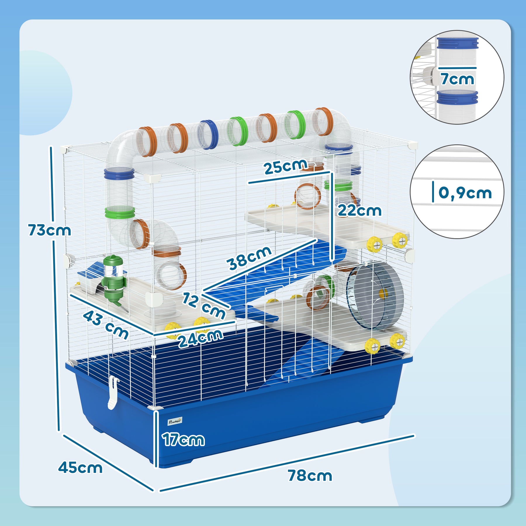 Udforsk den farverige verden i dette dværghamsterbur, et dynamisk habitat i 4 niveauer! Dette rummelige bur til små dyr har et sjovt 7 cm rørsystem og inkluderer en række legetilbehør såsom siddepinde, ramper og et træningshjul. To fordøre giver nem adgang og rengøring, så dette sjove hjem til din lille opdagelsesrejsende altid forbliver rent.