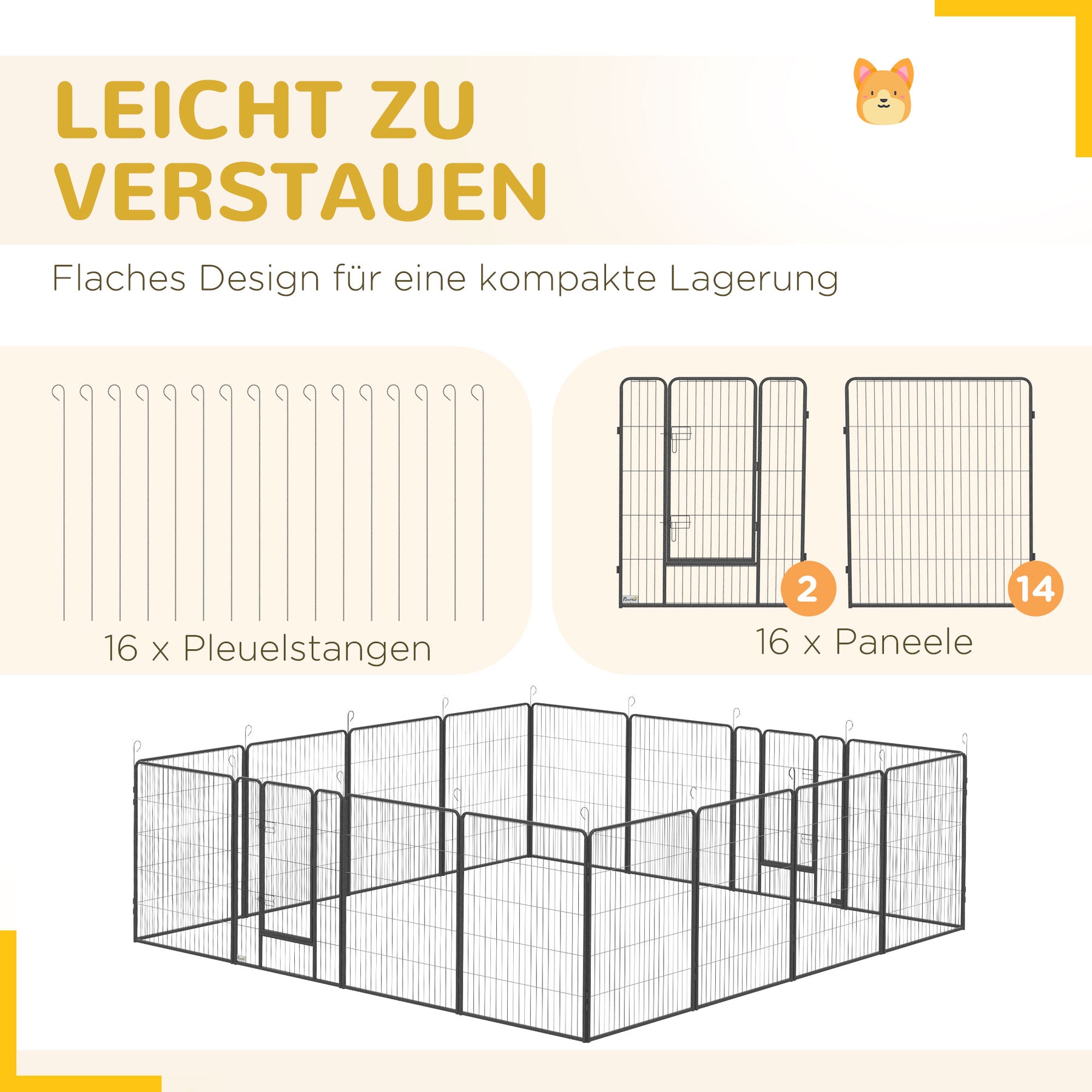 • Hvalpegård med 16 vægelementer, der kan sættes op i forskellige former, som rektangel, kvadrat eller L-form
