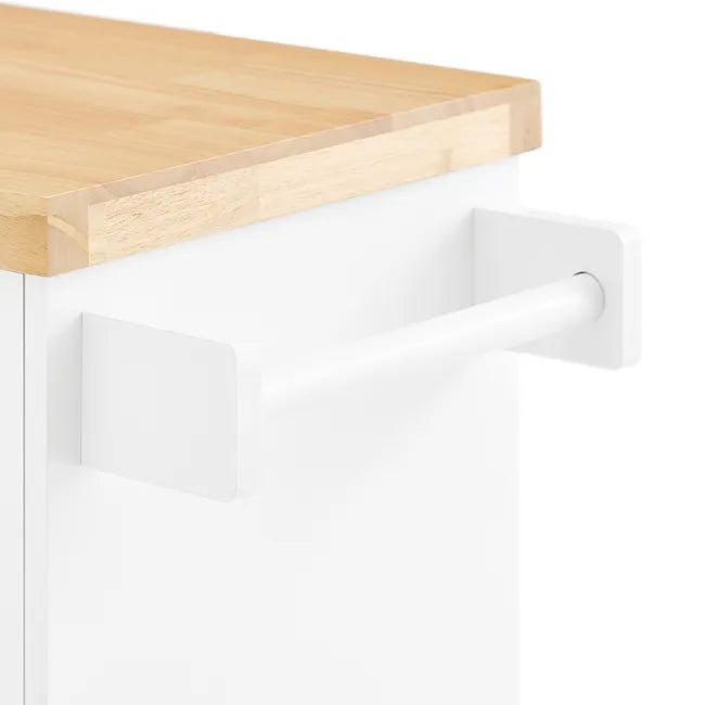Vognen har en stor bordplade, to skabe, to skuffer og en håndklædestang, der giver dig masser af plads til at holde orden i hjemmet. Den er fremstillet af MDF og gummitræ, som sikrer en lang levetid, og overfladen er let at vedligeholde med en fugtig klud. Med en samlet bæreevne på 90 kg er den både robust og stabil.