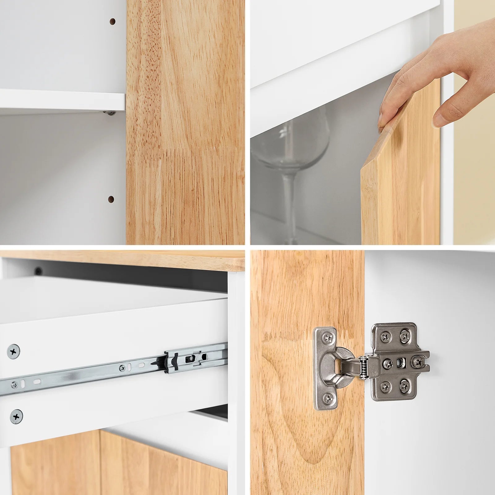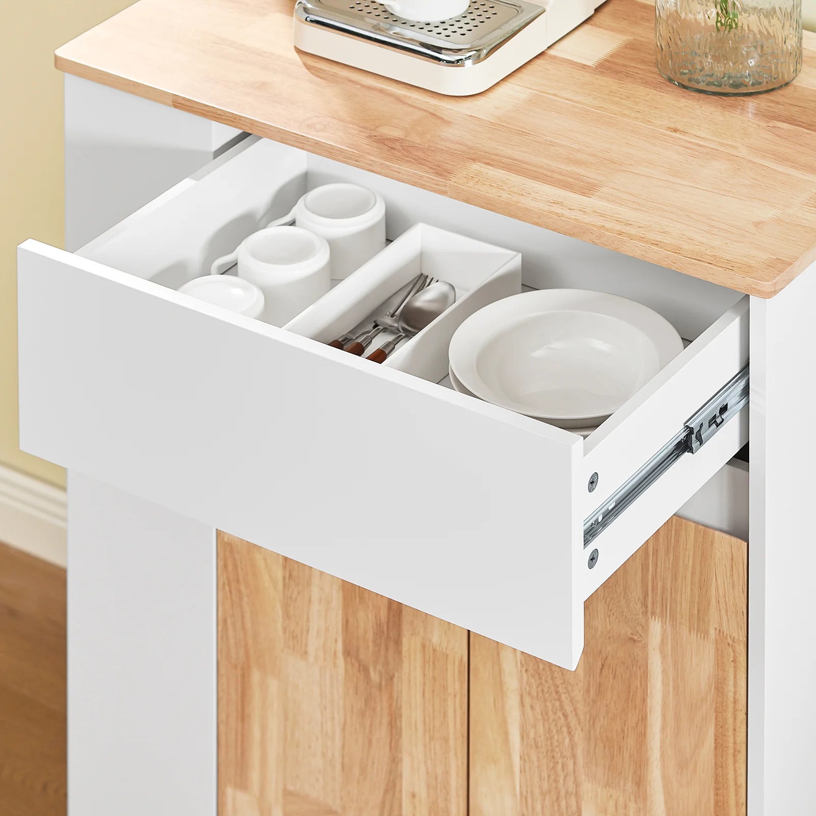 Vognen har en udtrækkelig skuffe, tre sidelister og et skab med justerbar hylde, så du kan organisere alt fra krydderier og flasker til tallerkener og småting. Den justerbare sidehylde sikrer fleksibel opbevaring, mens anti-tip sprosser holder dine ting sikkert.