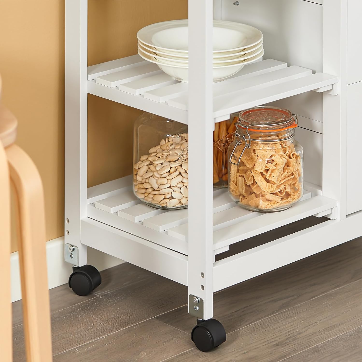 Vognen er udstyret med fire robuste hjul, hvoraf to kan låses, så den er let at flytte og stabil, når den står stille. Den øverste bakke kan tages af, så du nemt kan bære mad og drikke direkte fra vognen til bordet. De to nederste hylder kan også fjernes, så du kan opbevare større ting som blender eller flasker. Vognens fleksible design gør den også ideel som et rullende sidebord eller en flytbar opbevaringshylde.