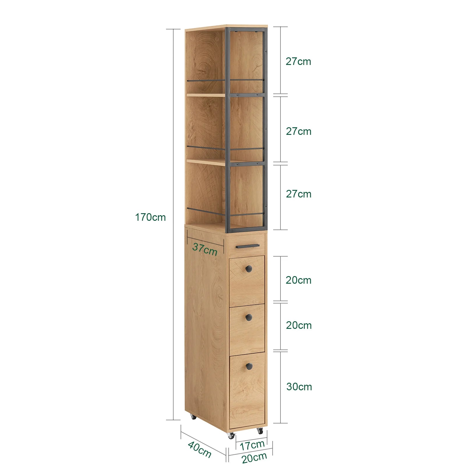 Oplev den perfekte kombination af naturlig elegance og moderne funktionalitet med dette smalle opbevaringsmøbel. Den lyse træfinish i samspil med de markante sorte metaldetaljer skaber en stilfuld løsning, der udnytter selv den smalleste plads optimalt.