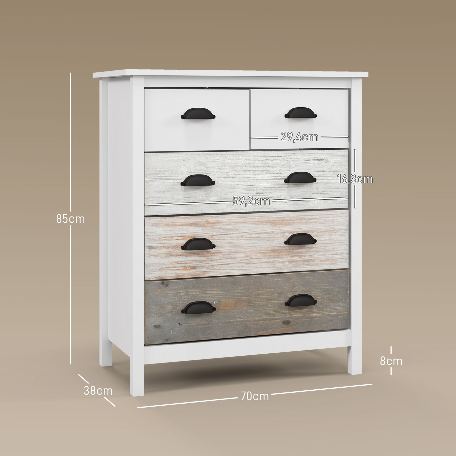 Giv liv til dit hjem med denne uimodståeligt charmerende kommode! Det elegante design i tidløse farver passer perfekt til din indretning og tilbyder rigelig opbevaringsplads med tre store og to små skuffer. Opbevar dit tøj, bøger og brætspil pænt, samtidig med at du udnytter den tilgængelige plads perfekt - en smagfuld og stilfuld kombination af æstetik og funktion!