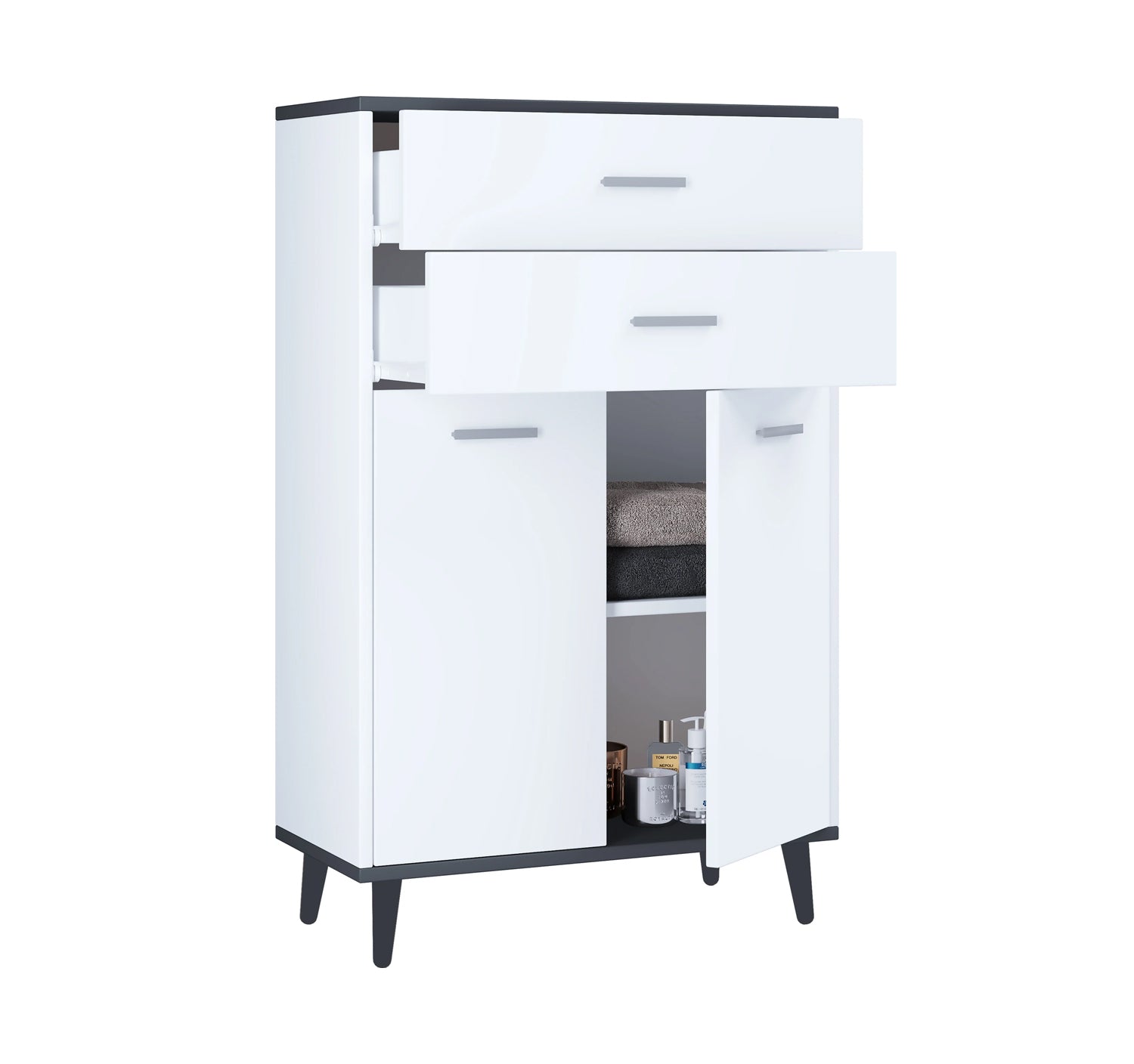 • Med sit tidløse og moderne design er den høje kommode et smukt blikfang i enhver stue. To skuffer og to store rum med praktiske hyldeinddelinger giver masser af opbevaringsplads.