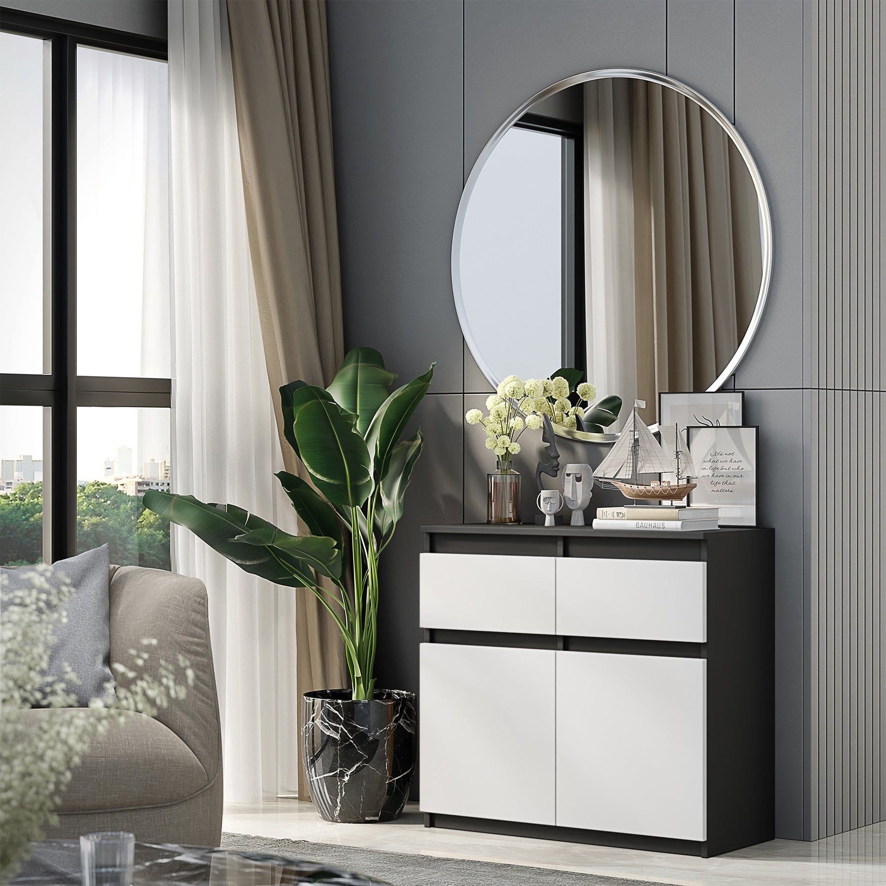 Angesichts der makellosen technischen Seite dieses Schranks denken Sie wahrscheinlich an seine optische Seite. Aber auch dieser wird Sie nicht enttäuschen - er ist ein vielseitiges Möbelstück. Die matte Farbkombination aus Anthrazit und Weiß wirkt äußerst cool, frisch und stilvoll. Diese Art von Duo, kombiniert mit einem schlichten Design, wird Ihnen jahrelang erhalten bleiben und trotzdem sehr modern aussehen. Eine Kommode mit zwei Schubladen wie diese ist ein wahrer Schatz für Ihre Wohnung.
