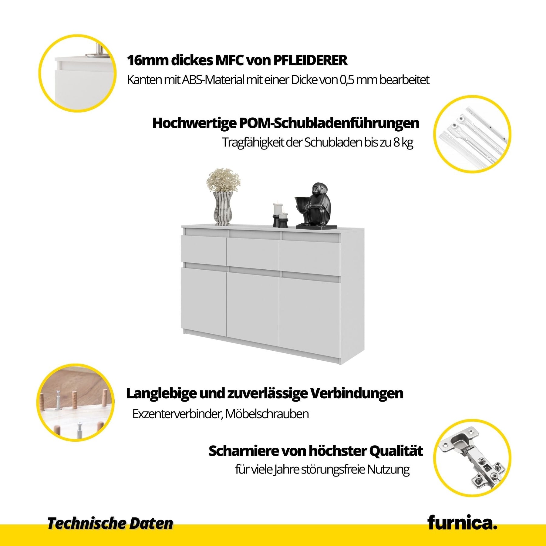Kommoden er udstyret med 3 rummelige skuffer og 3 låger, hvilket giver god plads til at organisere dine ejendele og skabe overblik i hverdagen. Du får en praktisk løsning, der hjælper med at holde hjemmet ryddeligt.