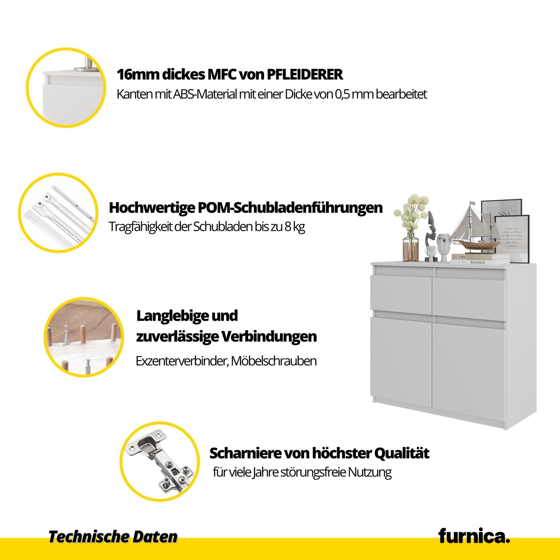 Kommoden er fremstillet af robuste materialer, herunder 16 mm melaminbelagt spånplade og høj densitet fiberplade, hvilket sikrer en solid, stabil og holdbar konstruktion. Alle nødvendige dele medfølger, og monteringen er enkel og hurtig.