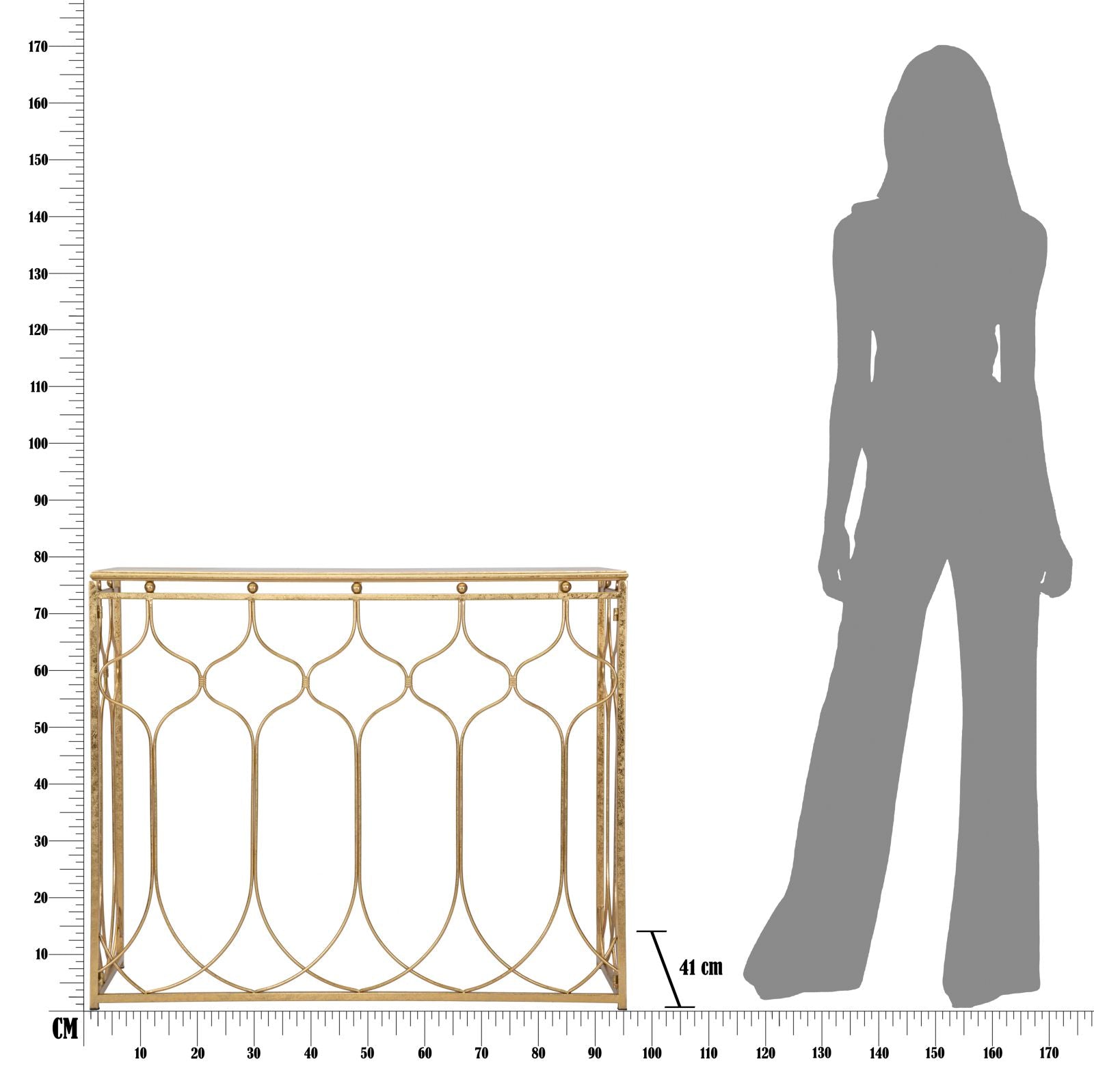 Konsolbordets rektangulære form og gyldne metalramme, er inspireret af arabisk arkitektur og dekorationer. Det tilfører et eksotisk og sofistikeret touch til enhver stue.