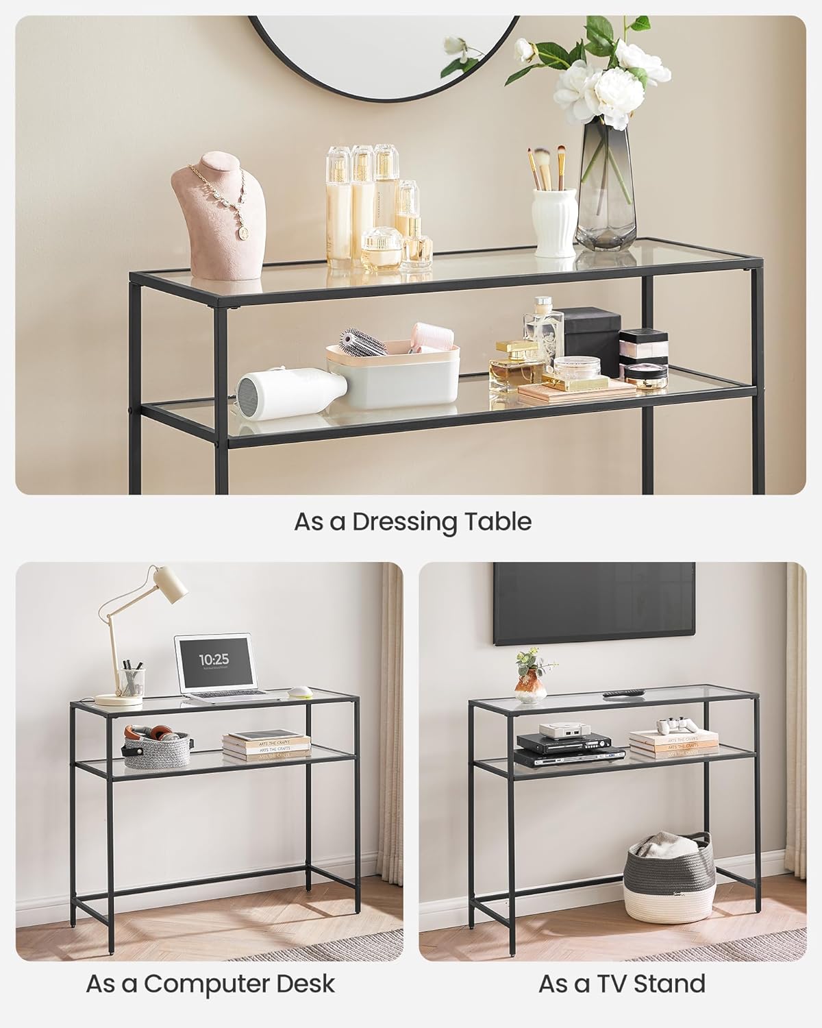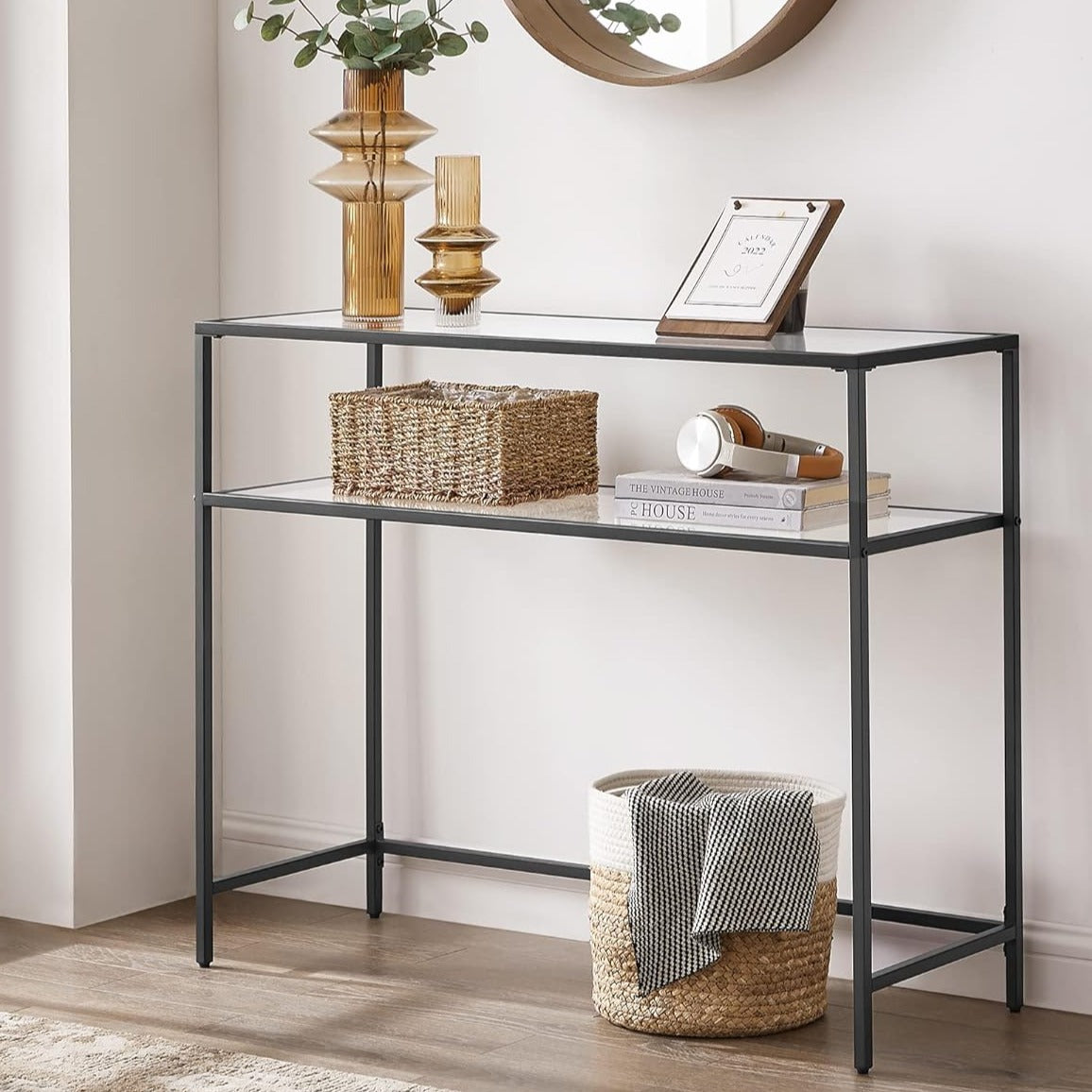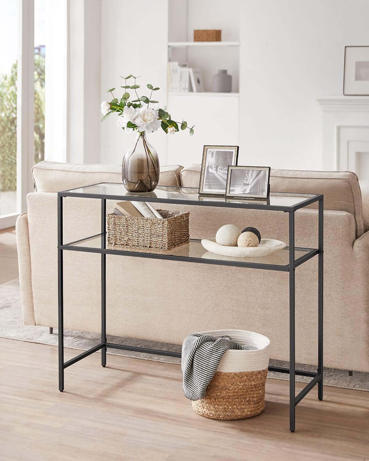 Dette moderne konsolbord er det perfekte valg for dig, der leder efter et stilfuldt og funktionelt møbel til dit hjem. Det har et sort stålstel og to hærdede glashylder, der vil tilføje et strejf af elegance og sofistikering til ethvert rum.