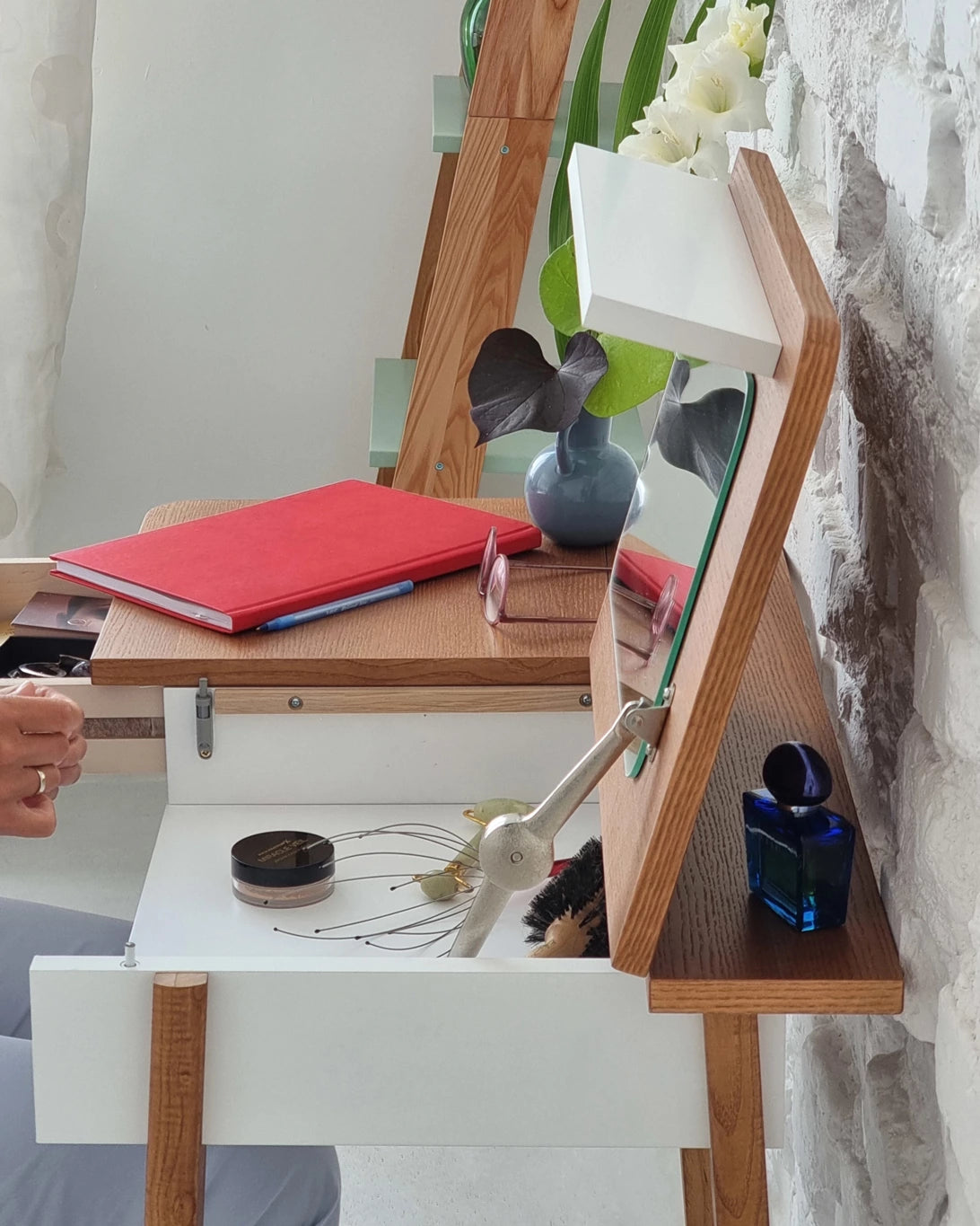 Dette skrivebord/sminkebord er ikke bare et smukt møbel, det er også utroligt praktisk. Med et skjult spejl, der nemt kan klappes op, forvandles bordet på et øjeblik til et elegant sminkebord. Perfekt til de dage, hvor du vil forkæle dig selv lidt ekstra. Når spejlet er nedfældet, fungerer bordet som et stilfuldt skrivebord eller et almindeligt bord.