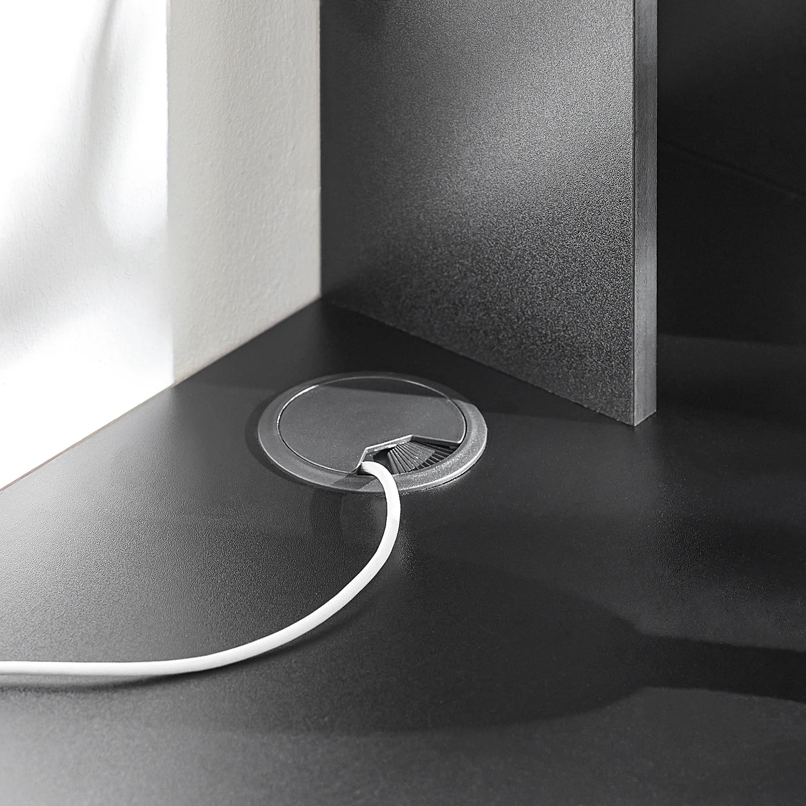 Bordet har en bordplade, en top- og sidehylde samt tre skuffer, der giver masser af opbevaringsplads. Det er udstyret med praktiske kabelhuller i både overfladen og midterskuffen, der holder dit arbejdsområde pænt og organiseret.