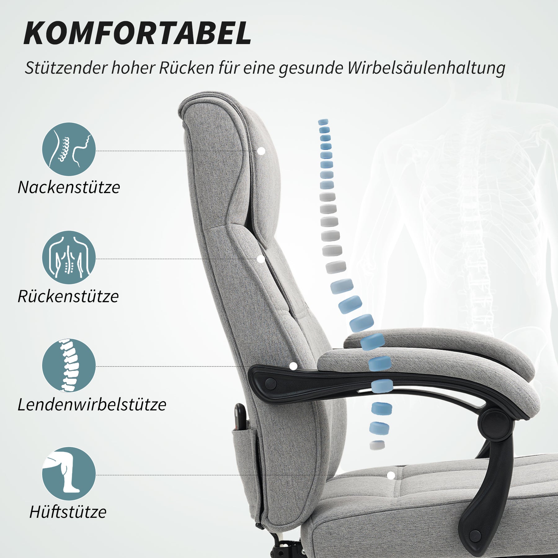 Nyd stilfuld afslapning i denne ergonomiske kontorstol, der har fem afslappende massageprogrammer og fire særlige punkter på nakke og talje for maksimal restitution. Det åndbare stof med linnedlook og det tykt polstrede sæde tilbyder maksimal komfort. Ryglænet og fodstøtten kan justeres separat og er nemme at betjene med den praktiske fjernbetjening med kabel.