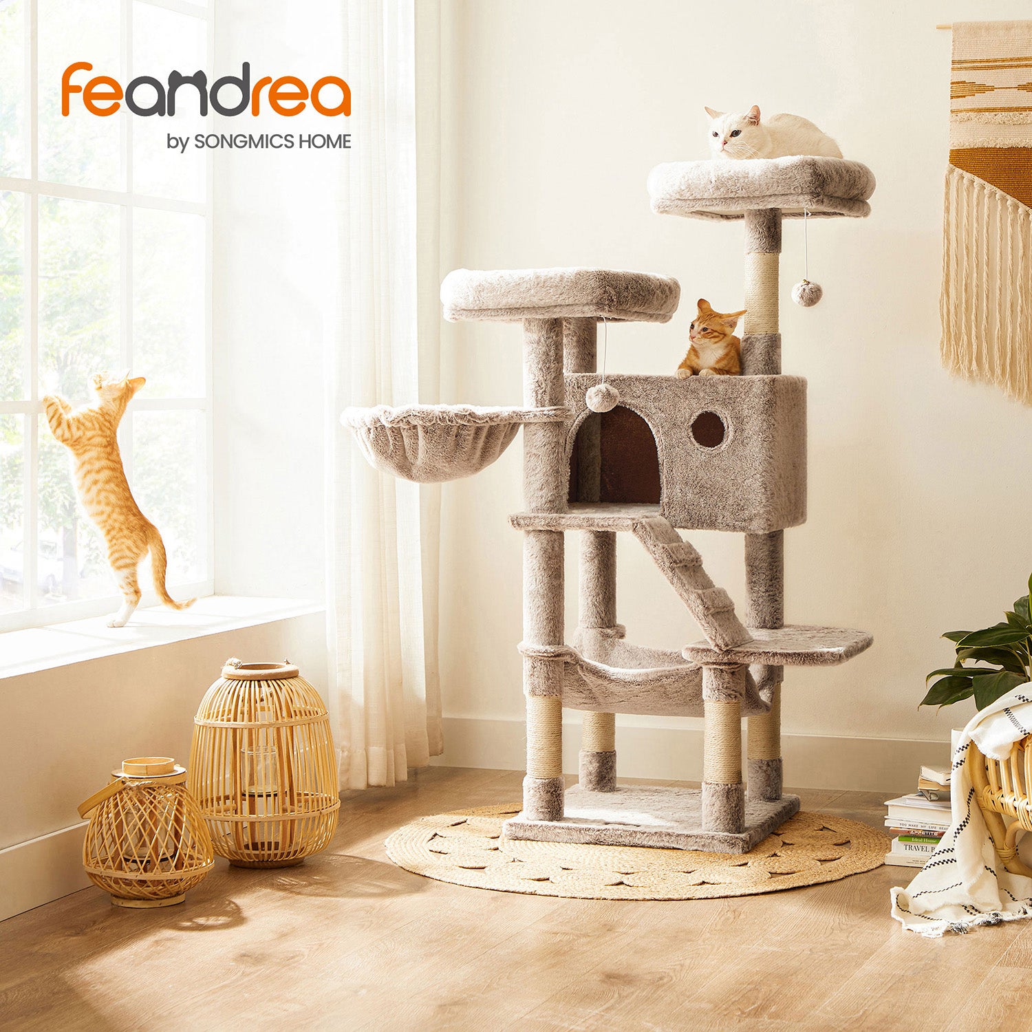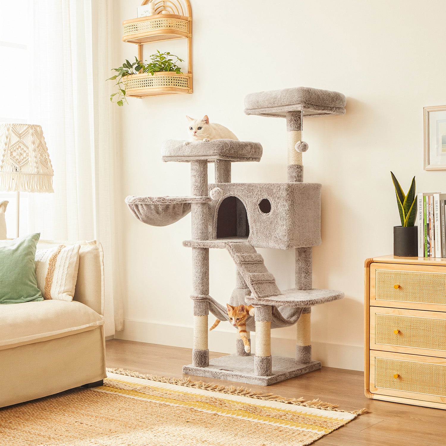 Kattetræet er fyldt med sjove funktioner, der holder din kat underholdt. Det har en trappe til nem klatring, sisalstolper til at slibe kløer, en hyggelig liggestol til afslapning, en hængekøje til en lur og to velpolstrede platforme med forhøjede kanter, der giver et godt overblik.