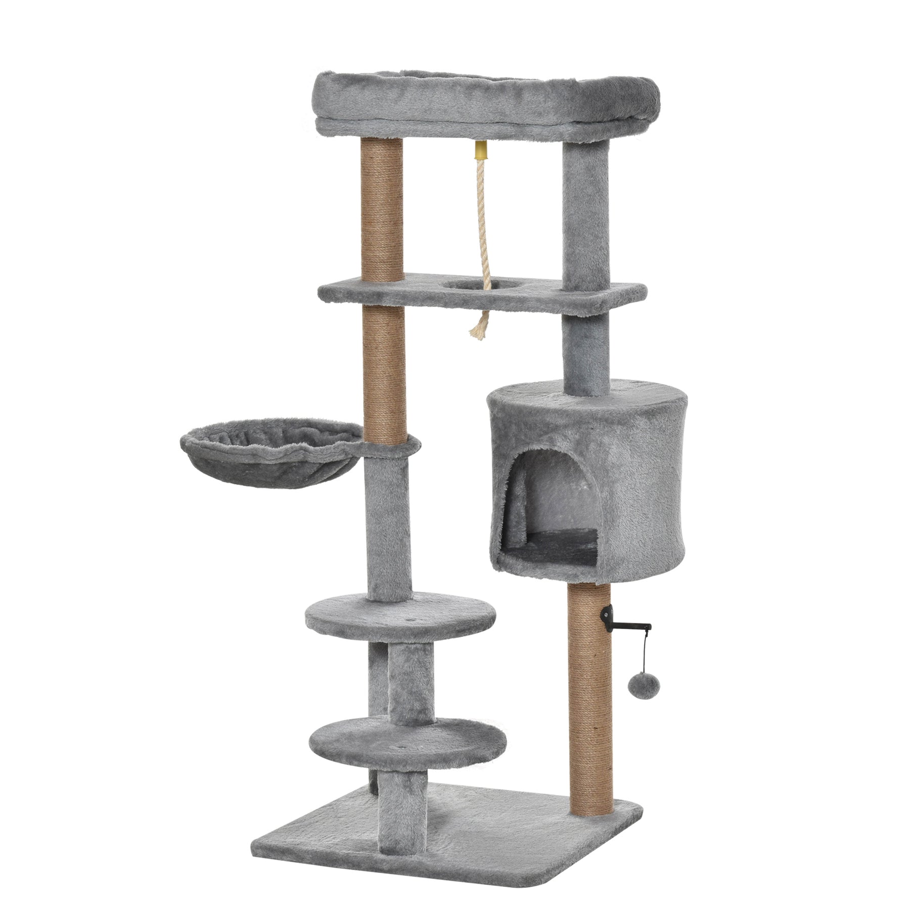 Hold din kat underholdt med dette kradsetræ, der tilbyder flere hvileområder og aktiviteter. Med et midterhus, en sidehængekøje og polstrede sovepladser, giver det dit kæledyr et sikkert sted at slibe kløer og beskytter dine møbler. Hvil, leg og motion - dette kradsetræ er perfekt til katte hele dagen og natten.