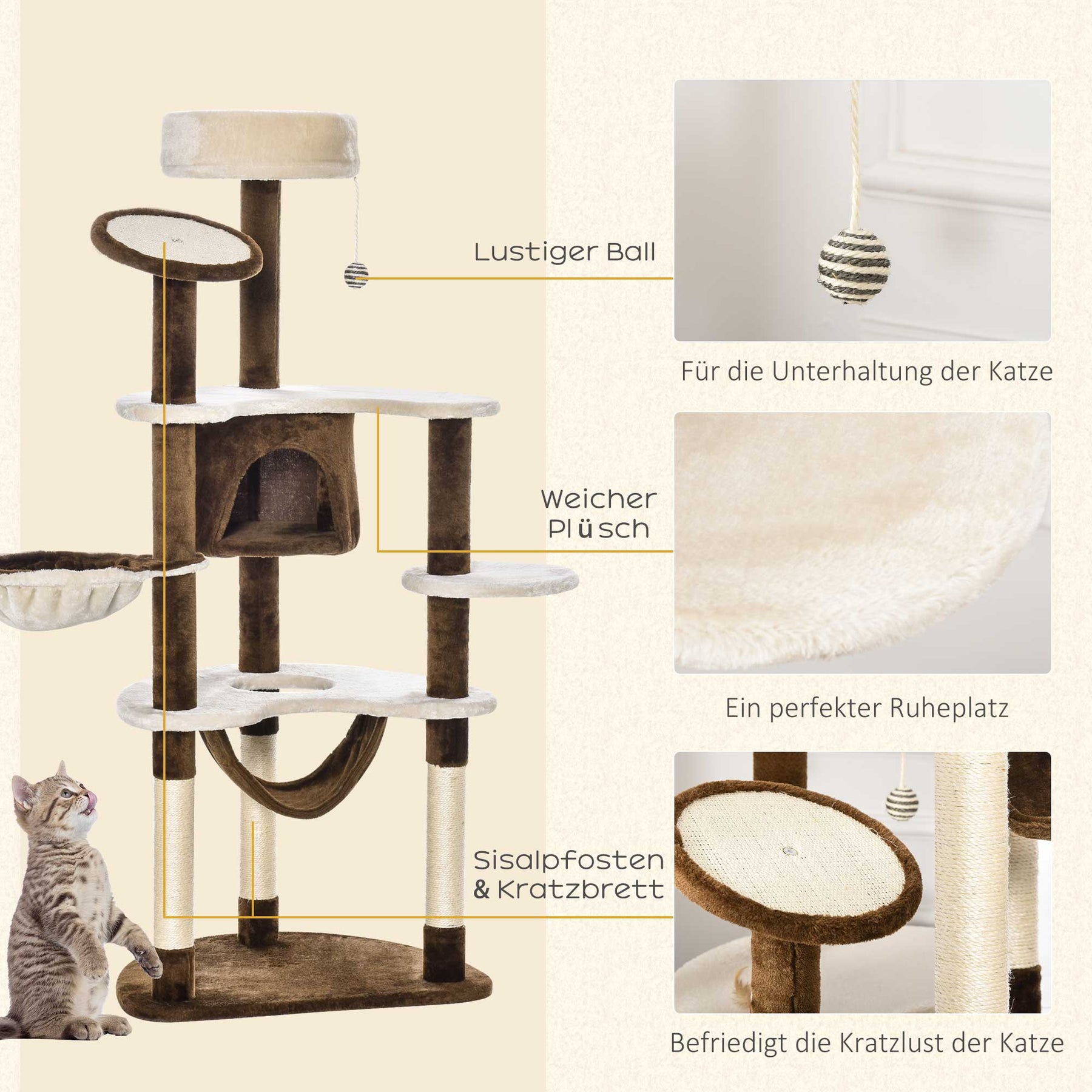 Oplev et alsidigt kradsetræ designet til at underholde og forkæle dine pelsede venner! Med en sovehule, plyslegebold, to hængekøjer og mange andre spændende funktioner, vil dine katte aldrig kede sig. Dette kradsetræ tilbyder også masser af plads til at hvile og slappe af på det bløde, nuttede plysbetræk.