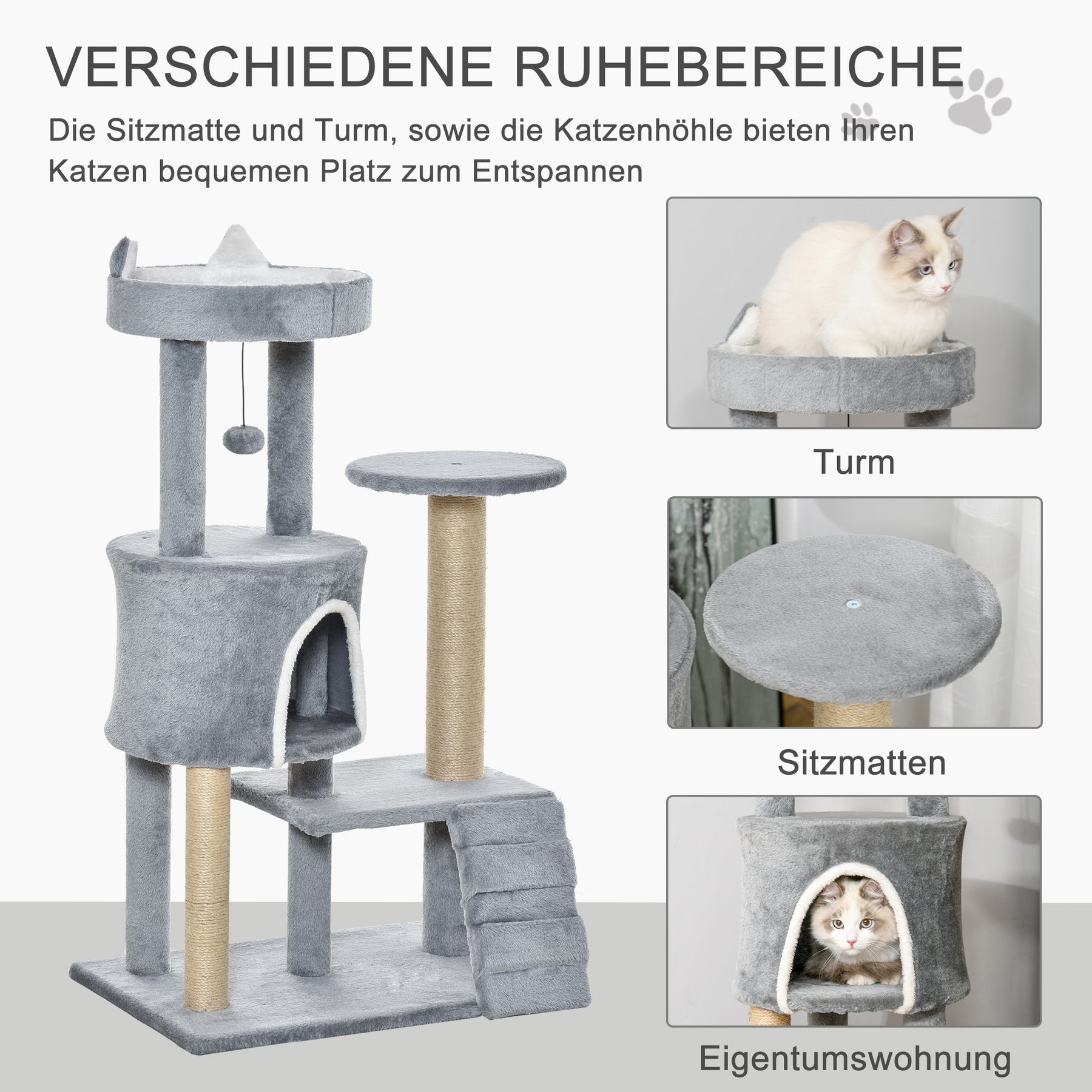 Dette kradsetræ er det perfekte aktivitetscenter for din kat, hvor den kan klatre, lege og slappe af i trygge rammer. Med fire niveauer og et blødt plyssedække er det designet til at give din kat både underholdning og komfort. Sisalrebstolperne sikrer, at dine møbler forbliver intakte, mens et integreret legetøj holder legen i gang.