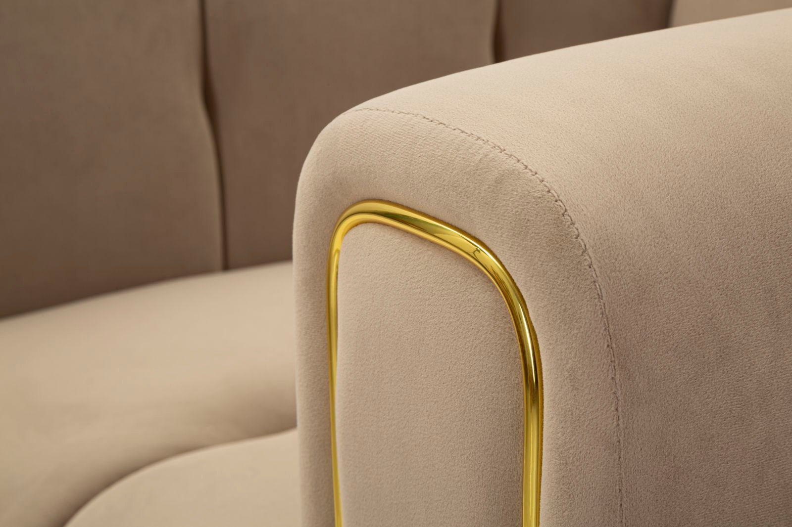 Denne elegante lænestol fra Glam-serien er en perfekt kombination af funktion og stilfuldt design. Stolen er fremstillet af et robust stel af eukalyptustræ, fyrretræ og krydsfiner, og er polstret med skum. Den er betrukket med blødt, quiltet fløjl i en smuk duegrå farve. De gyldne metalben tilføjer et strejf af luksus og udstråler kvalitet og godt håndværk.