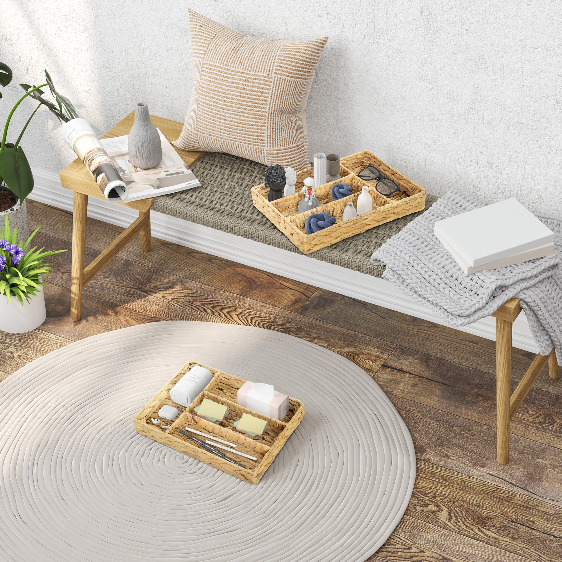 Sæt orden i dit hjem med dette sæt af to håndflettede opbevaringskurve. Disse alsidige kurve med fire rum er fremstillet af naturlig vandhyacint og sikrer, at alt fra kontorartikler til bestik har en fast plads. Deres udseende tilføjer en rustik elegance til ethvert rum, mens den robuste metalramme holder dine ting organiseret og inden for rækkevidde.