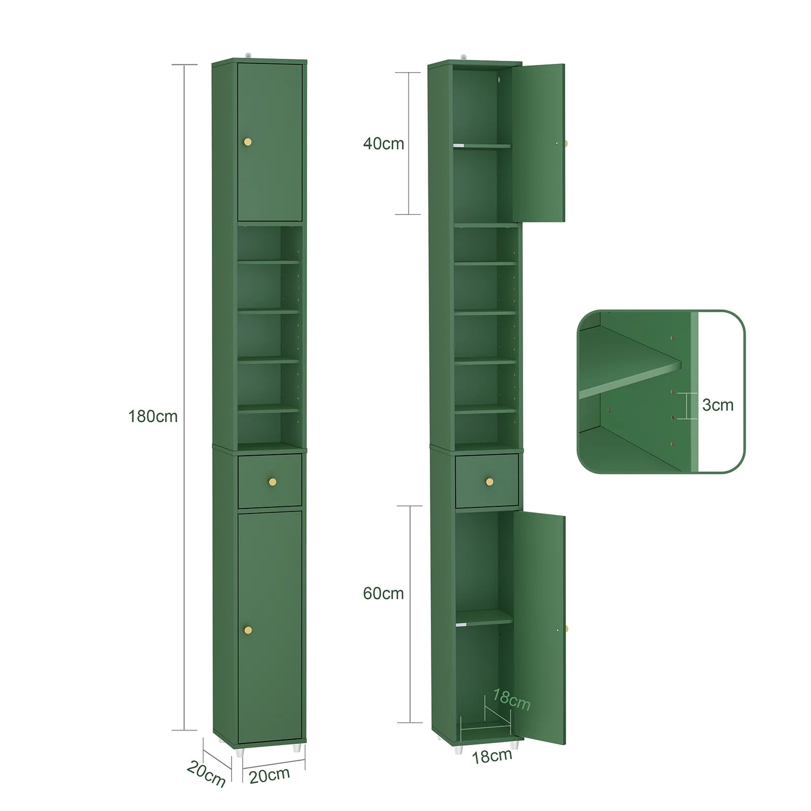 Har du begrænset plads på badeværelset? Dette smalle og elegante skab er designet til at udnytte hvert eneste hjørne af dit hjem. Med en bredde på kun 20 cm passer det perfekt ind i små badeværelser, smalle gange eller andre rum, hvor du har brug for ekstra opbevaringsplads uden at det fylder for meget.