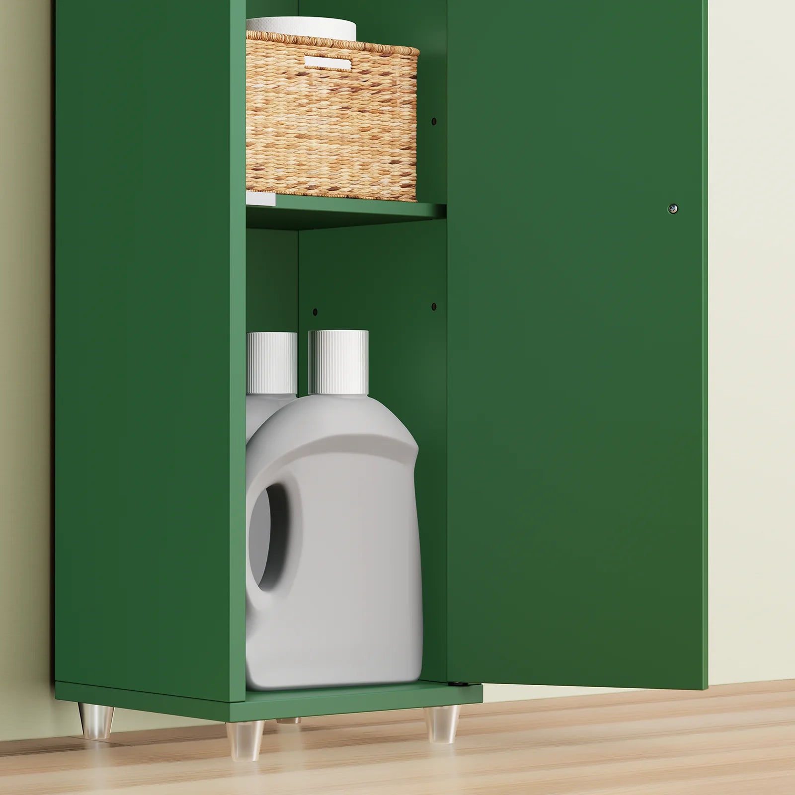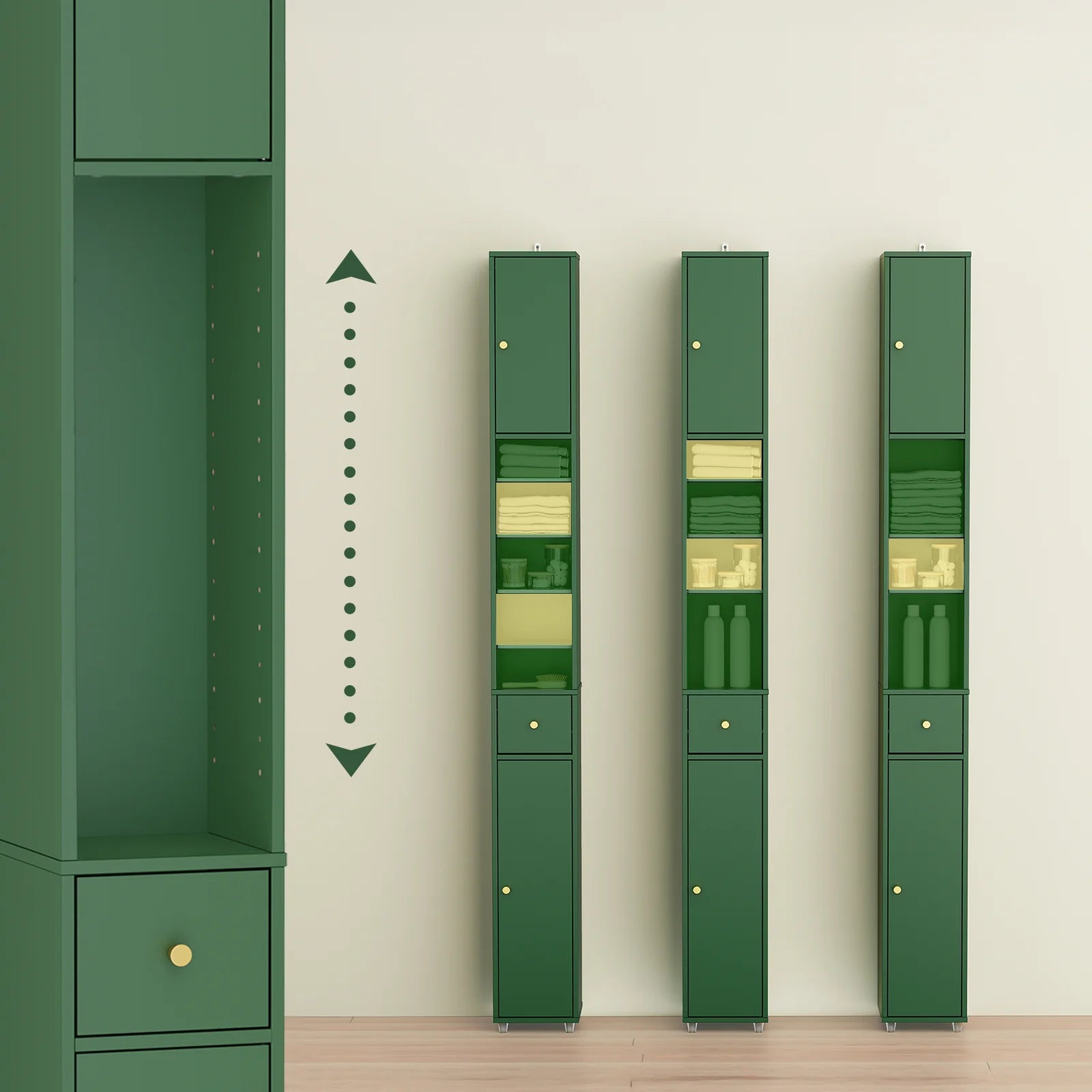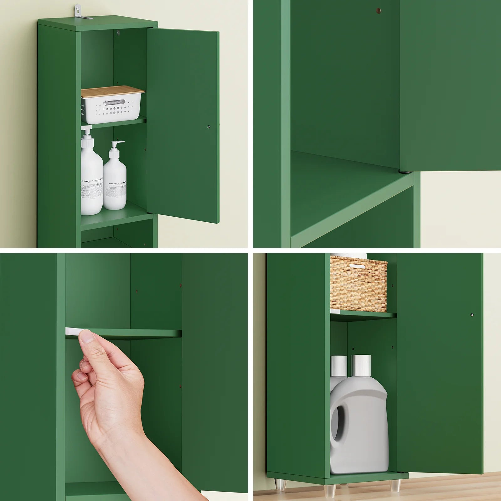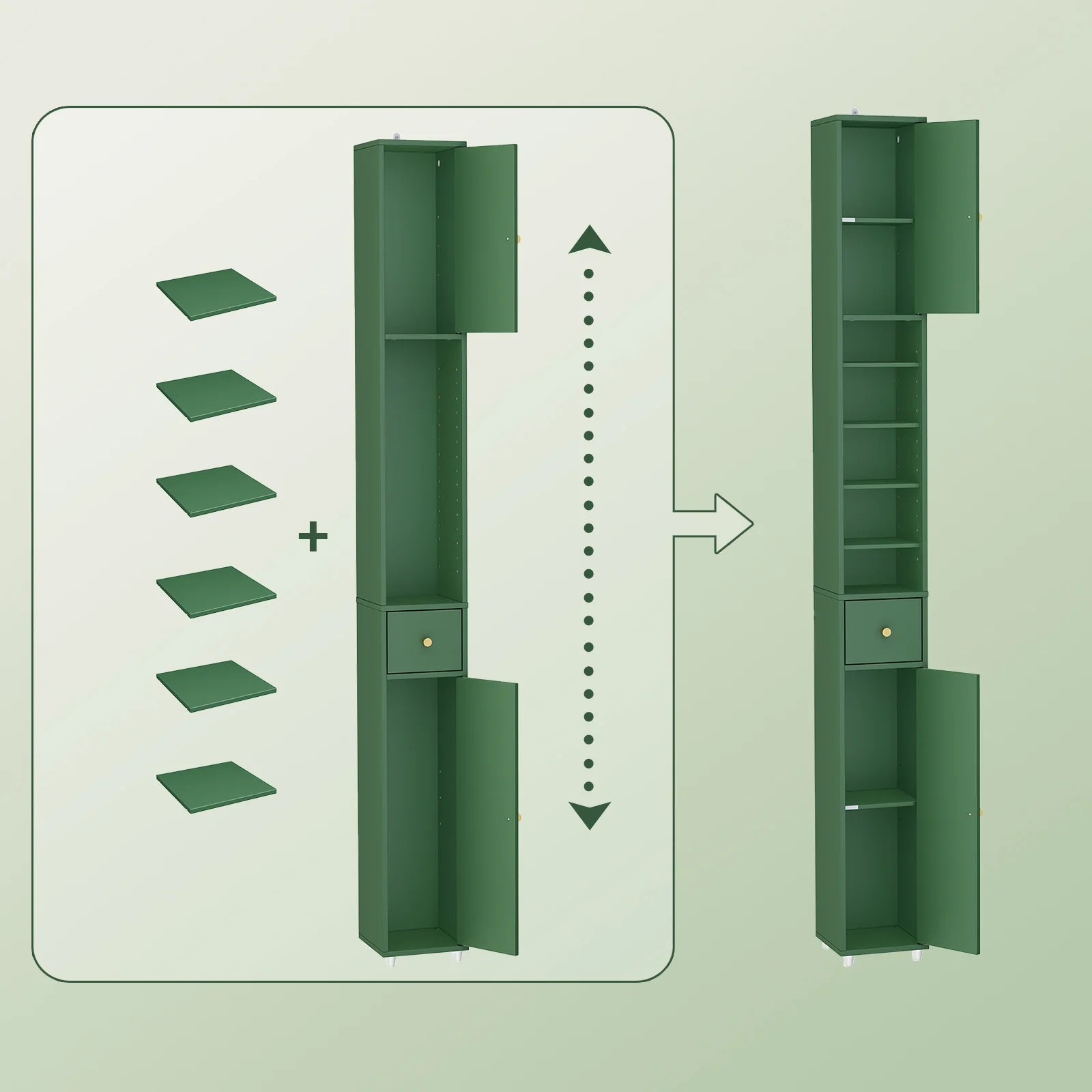 Skabet har en central skuffe og justerbare hylder, så du nemt kan tilpasse indretningen. Uanset om du skal opbevare kosmetik, rengøringsmidler eller toiletartikler, giver dette skab dig en fleksibel og personlig opbevaringsløsning. Du kan let flytte hylderne, så de passer til netop dine ting.