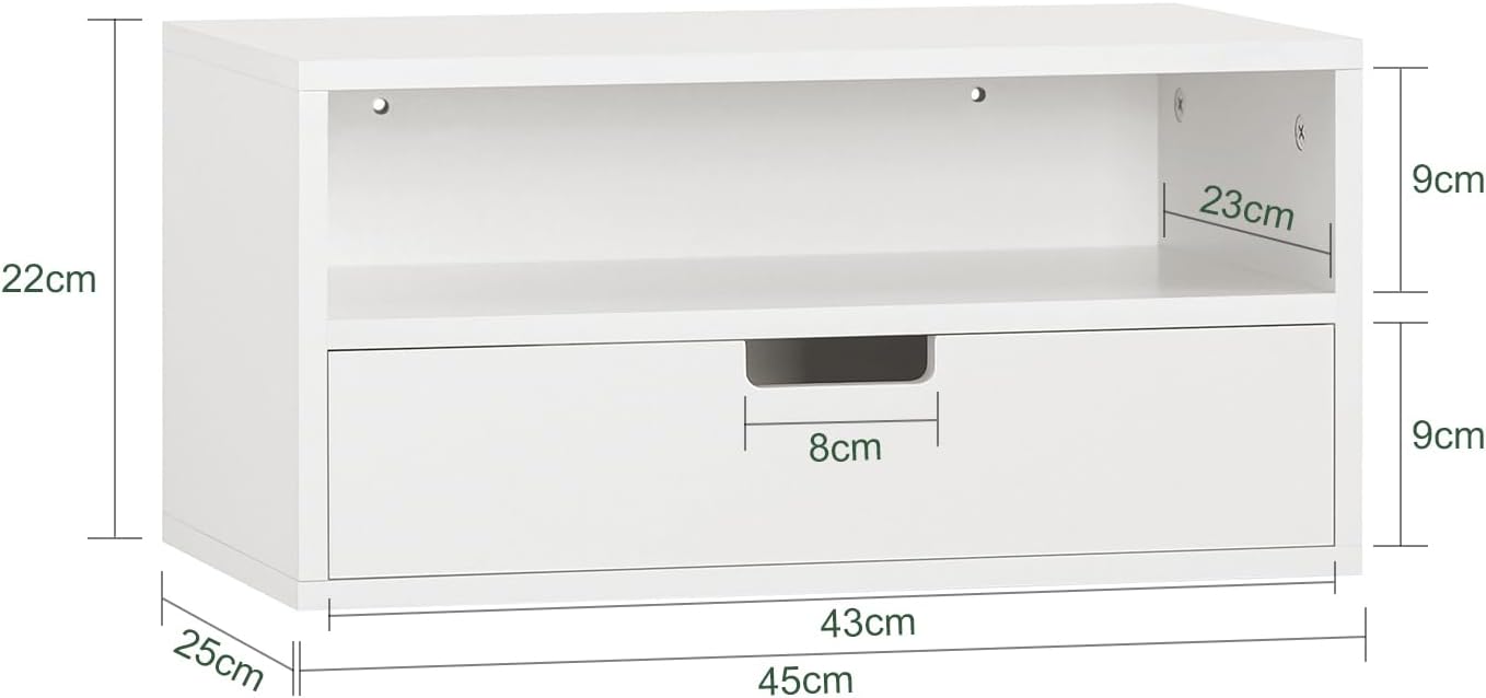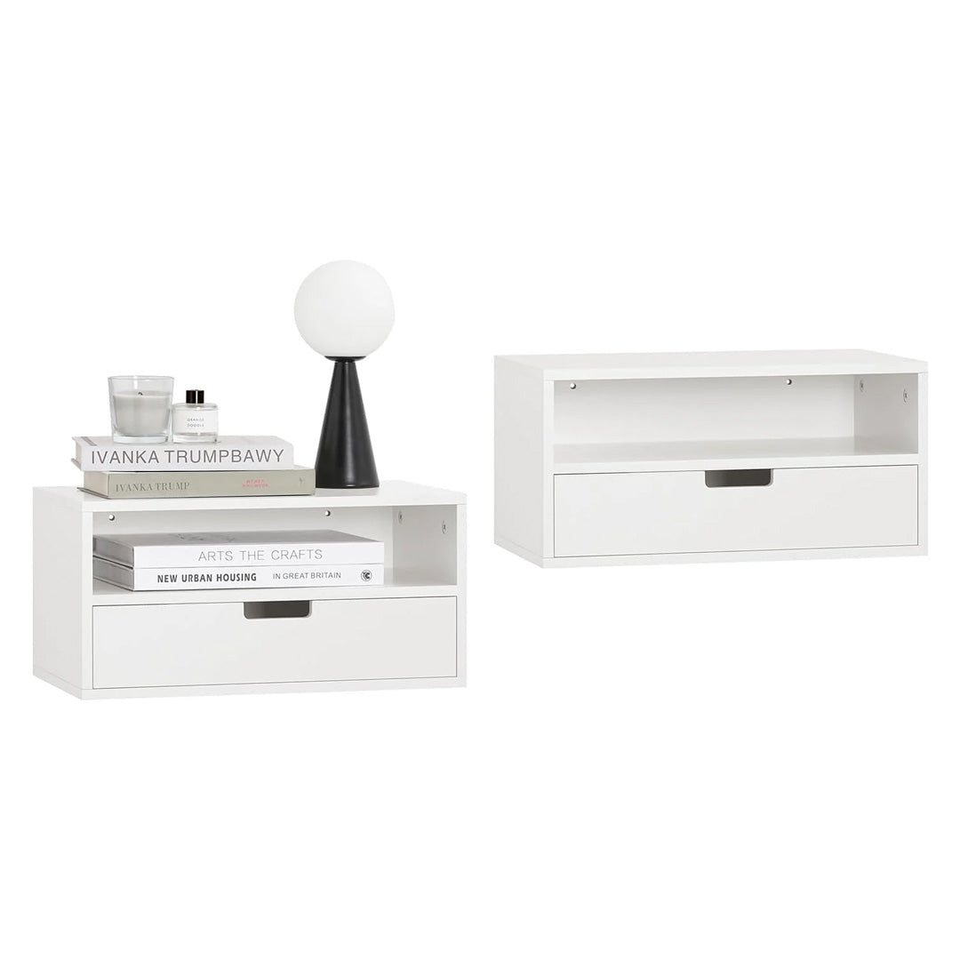 Sæt med 2 vægsengebord - pladsbesparende, skuffe og åbent rum, vægmonteret natbord, B45 x D25 x H22 cm, hvid