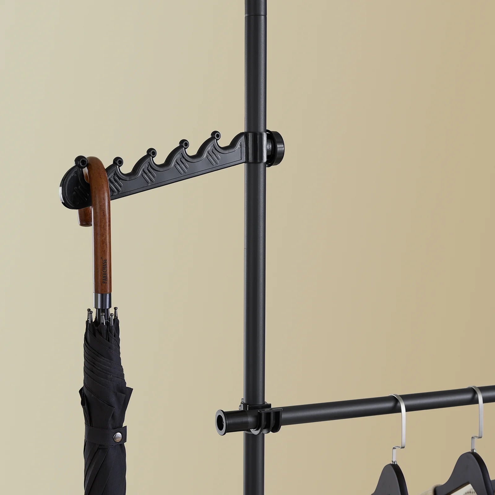 To praktiske hylder til sko, æsker eller foldede tøj, samt en sidekrog til tasker, hatte, tørklæder eller slips. Derudover medfølger 10 ekstra kroge til at hænge flere tøjgenstande og accessories – perfekt til små rum!