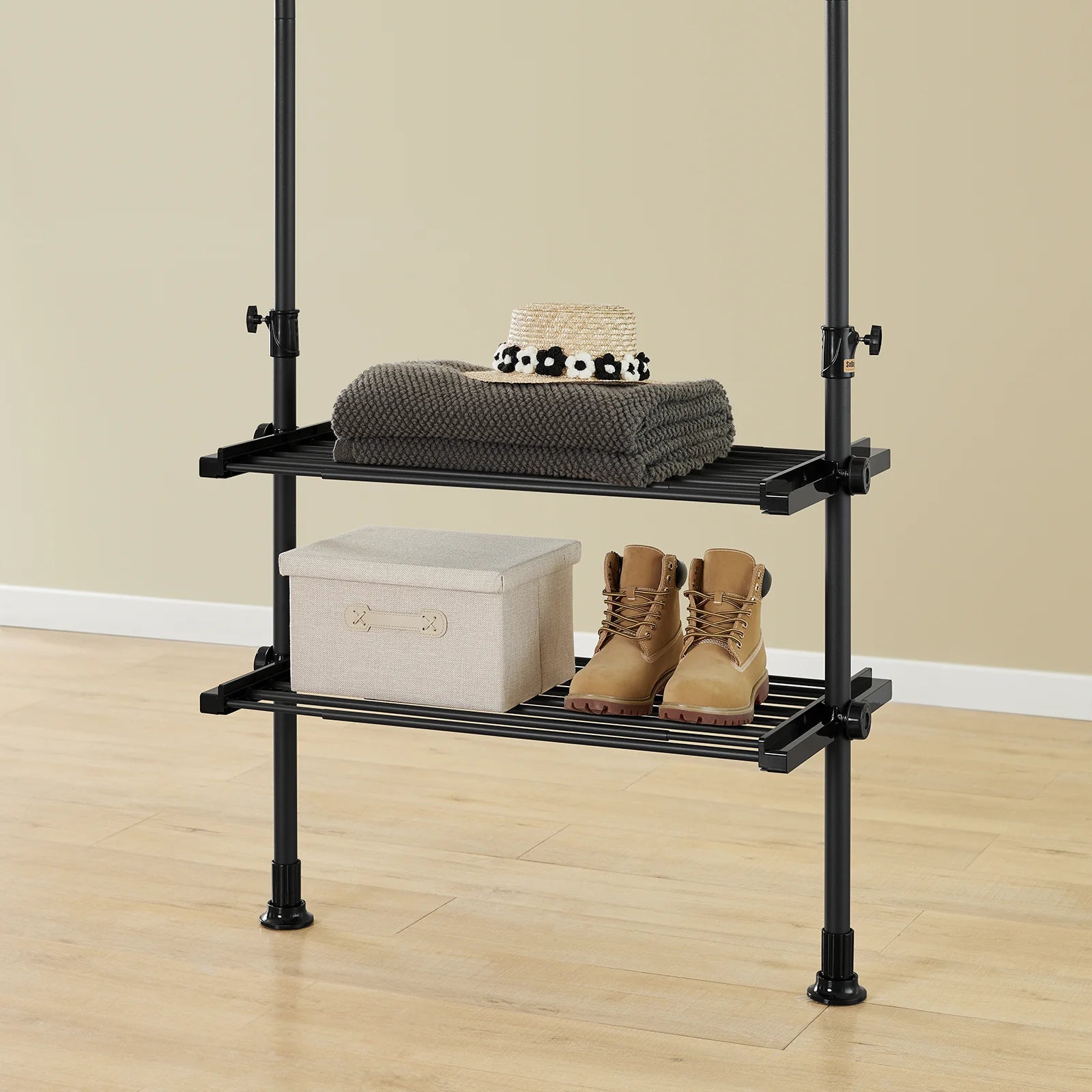 Udvendt med 3 vertikale teleskopstænger, 3 tøjstænger, 2 hylder og en sidekrog – skab nemt en tilpasningsbar åben garderobe. Perfekt til soveværelse, gang eller walk-in closet – ingen permanent installation kræves.