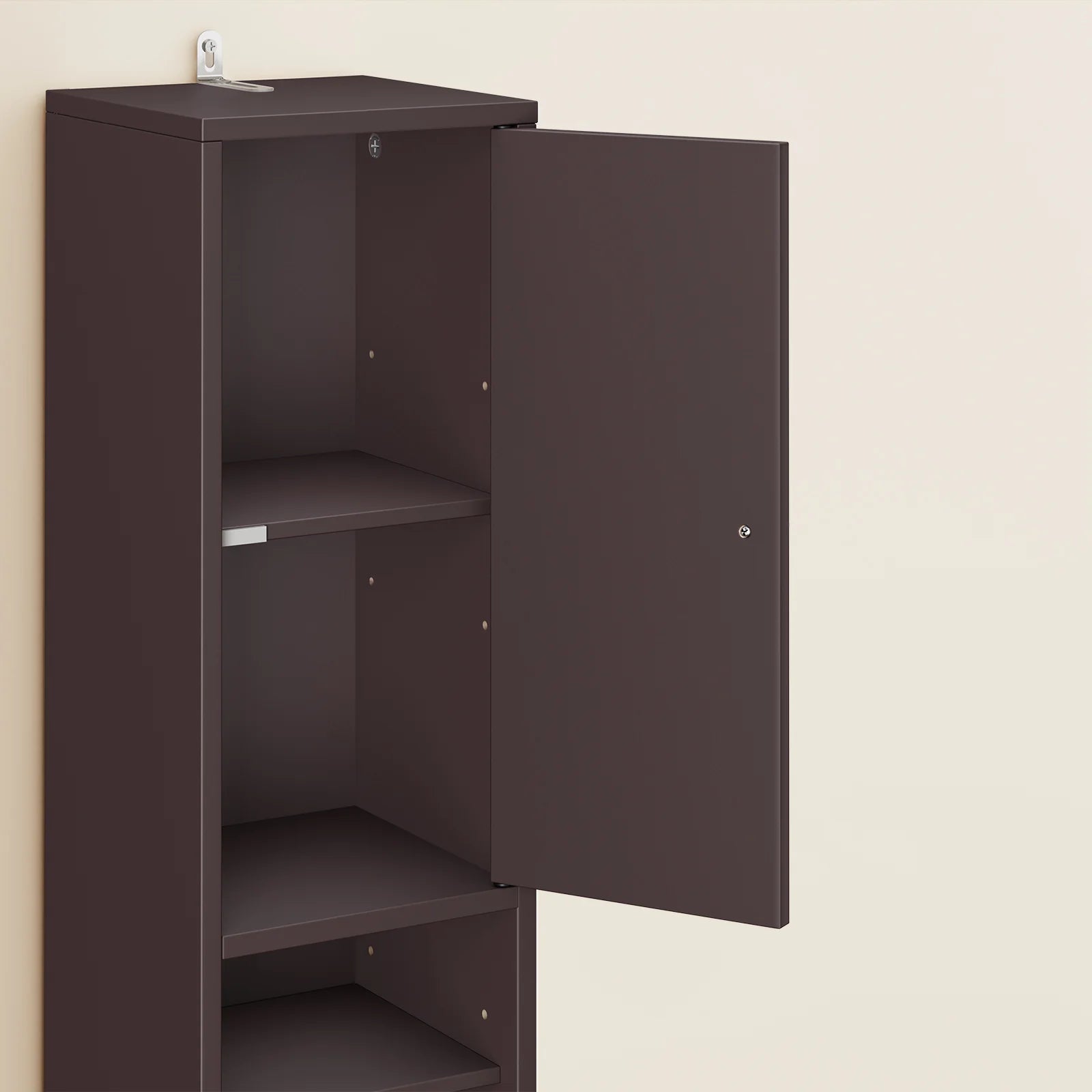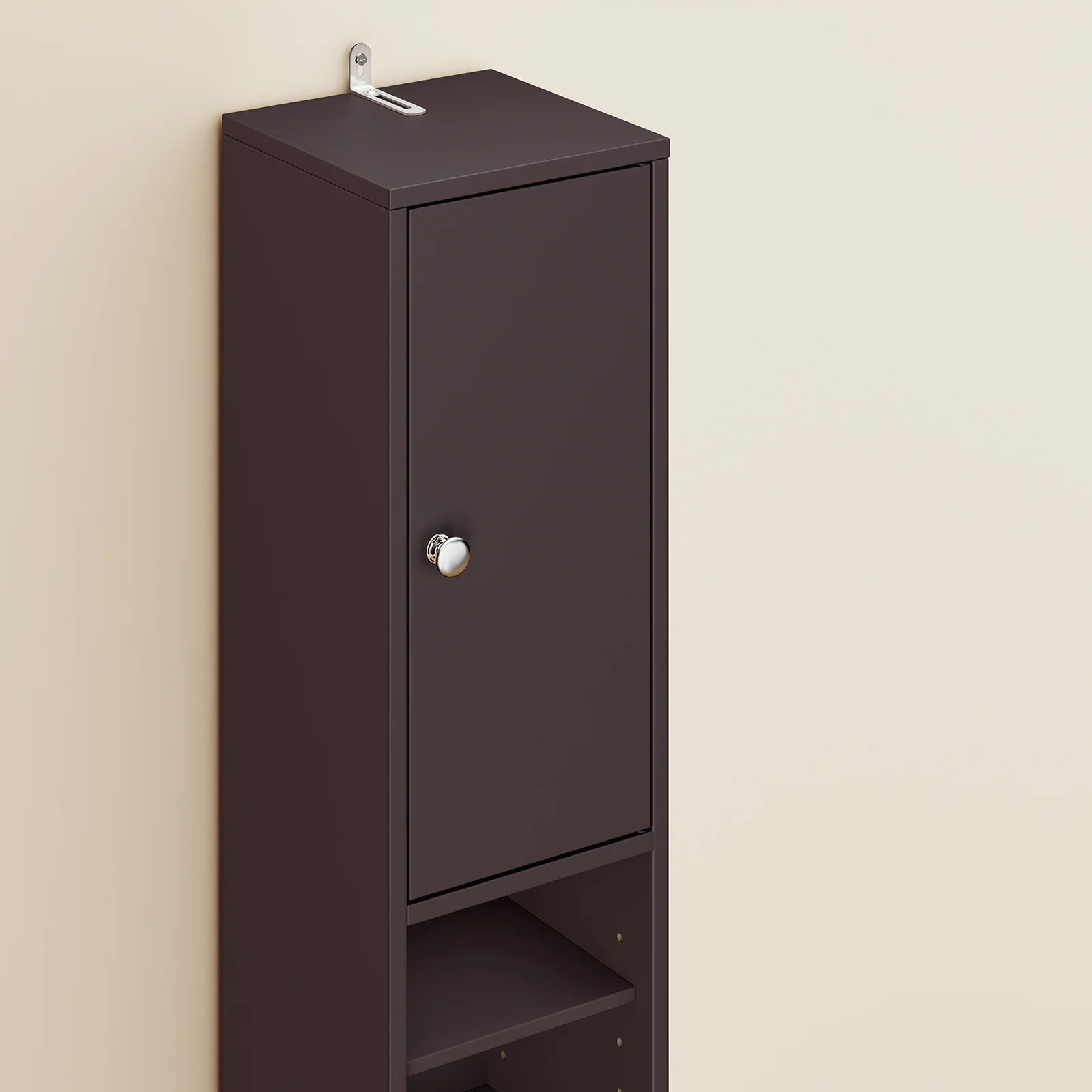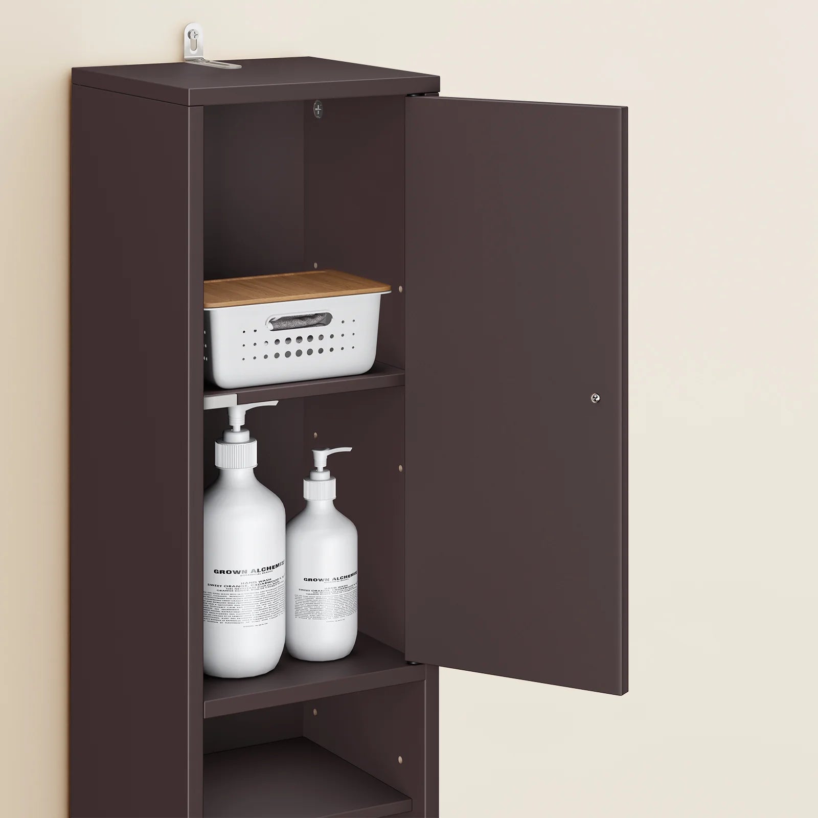 Den tidløse brune farve passer ind i alle indretningsstile – moderne, skandinavisk eller industriel. Brug det som badeværelsesskab, smal toilet hylde eller som et praktisk opbevaringsskab i entré, kontor eller stue.