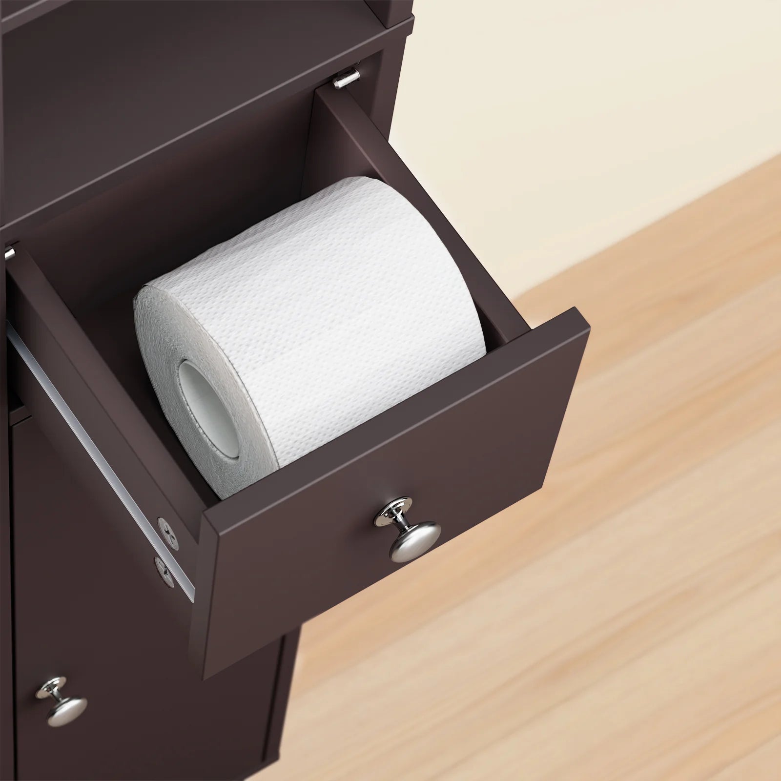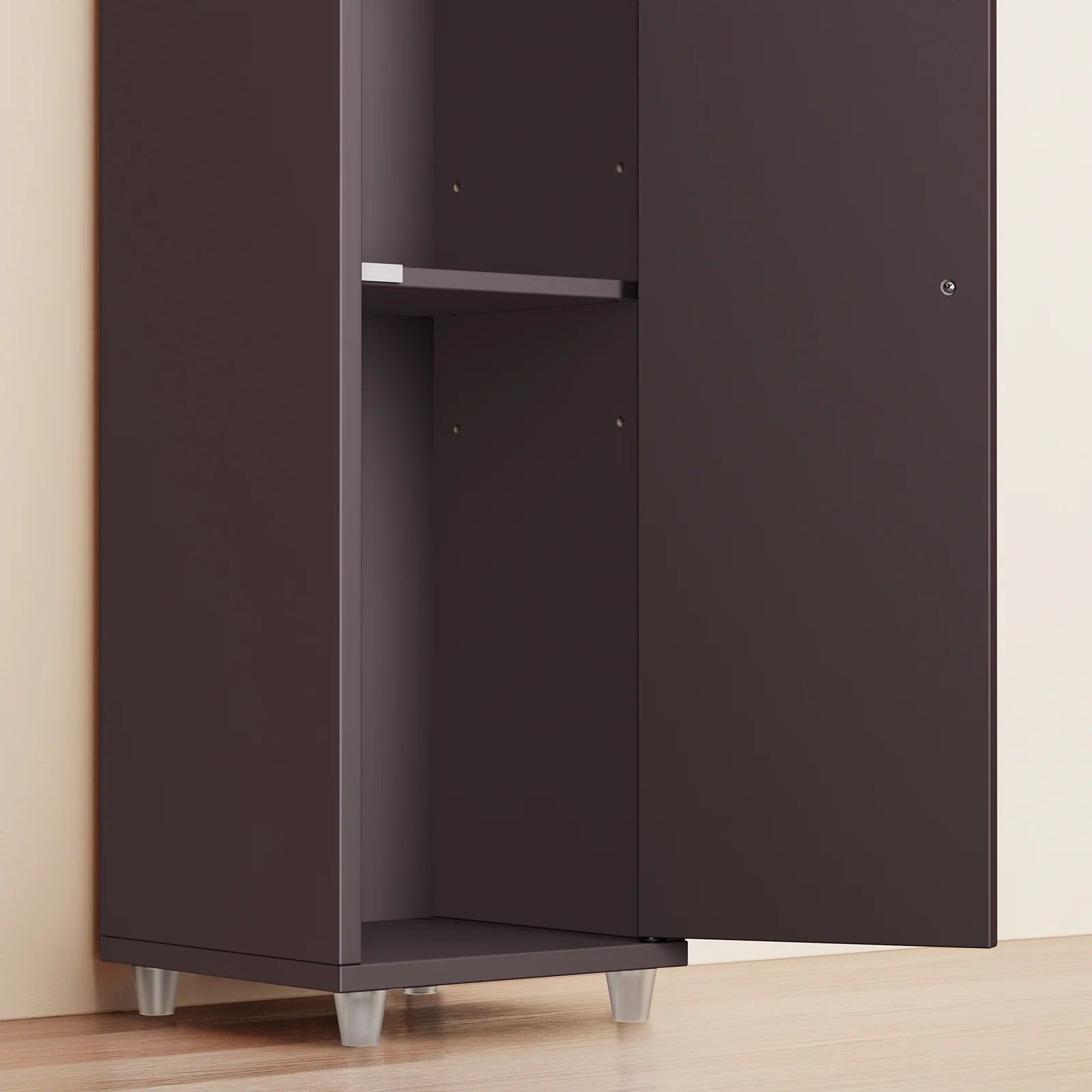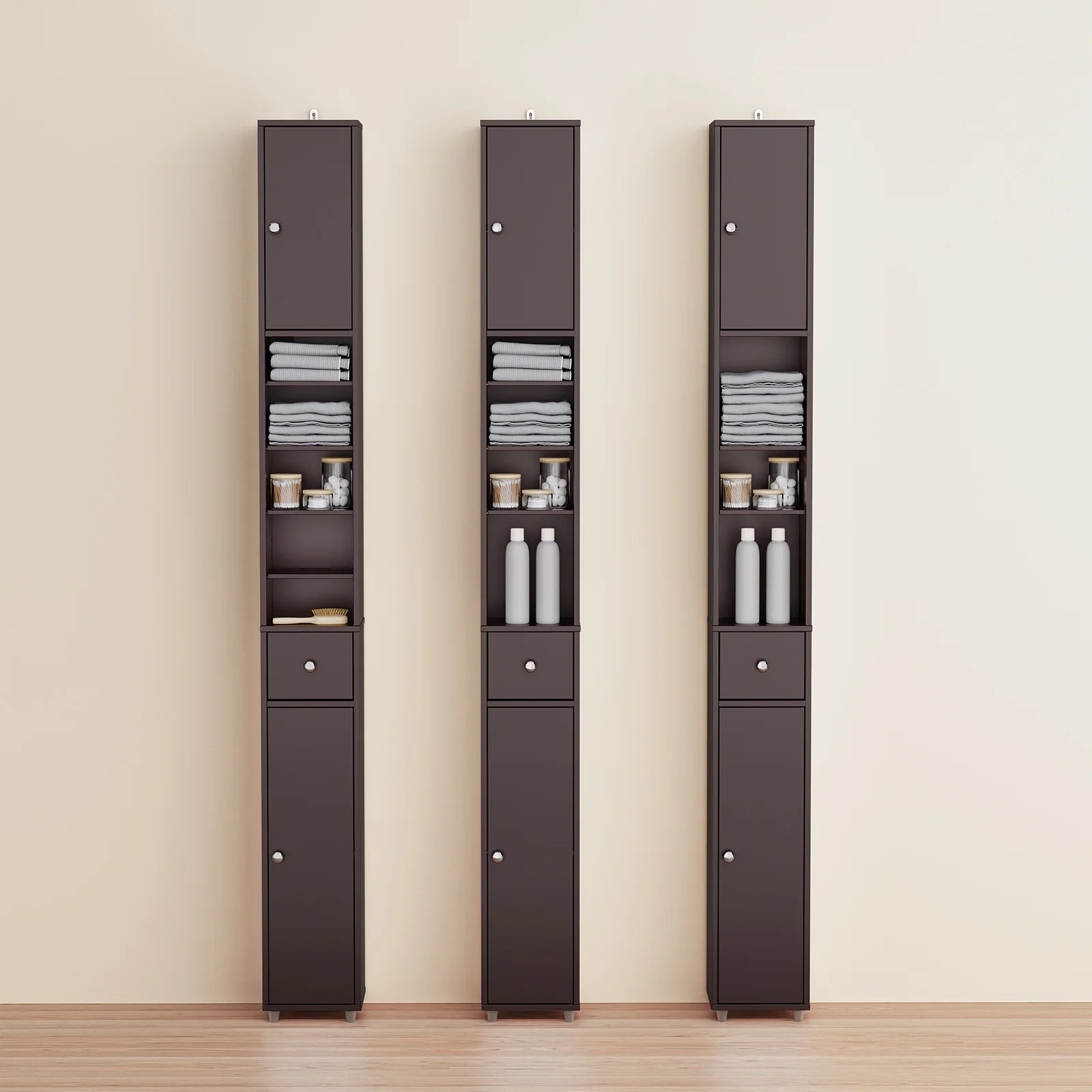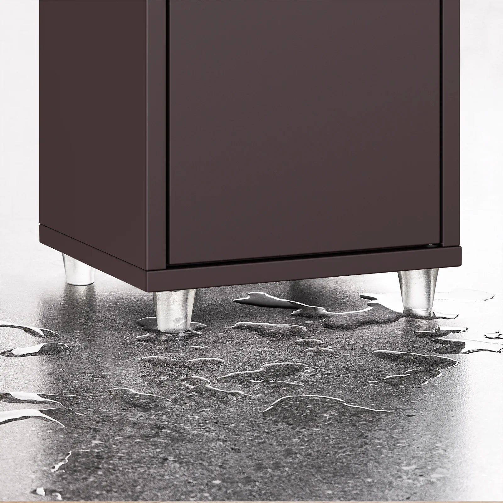 Den tidløse brune farve passer ind i alle indretningsstile – moderne, skandinavisk eller industriel. Brug det som badeværelsesskab, smal toilet hylde eller som et praktisk opbevaringsskab i entré, kontor eller stue.