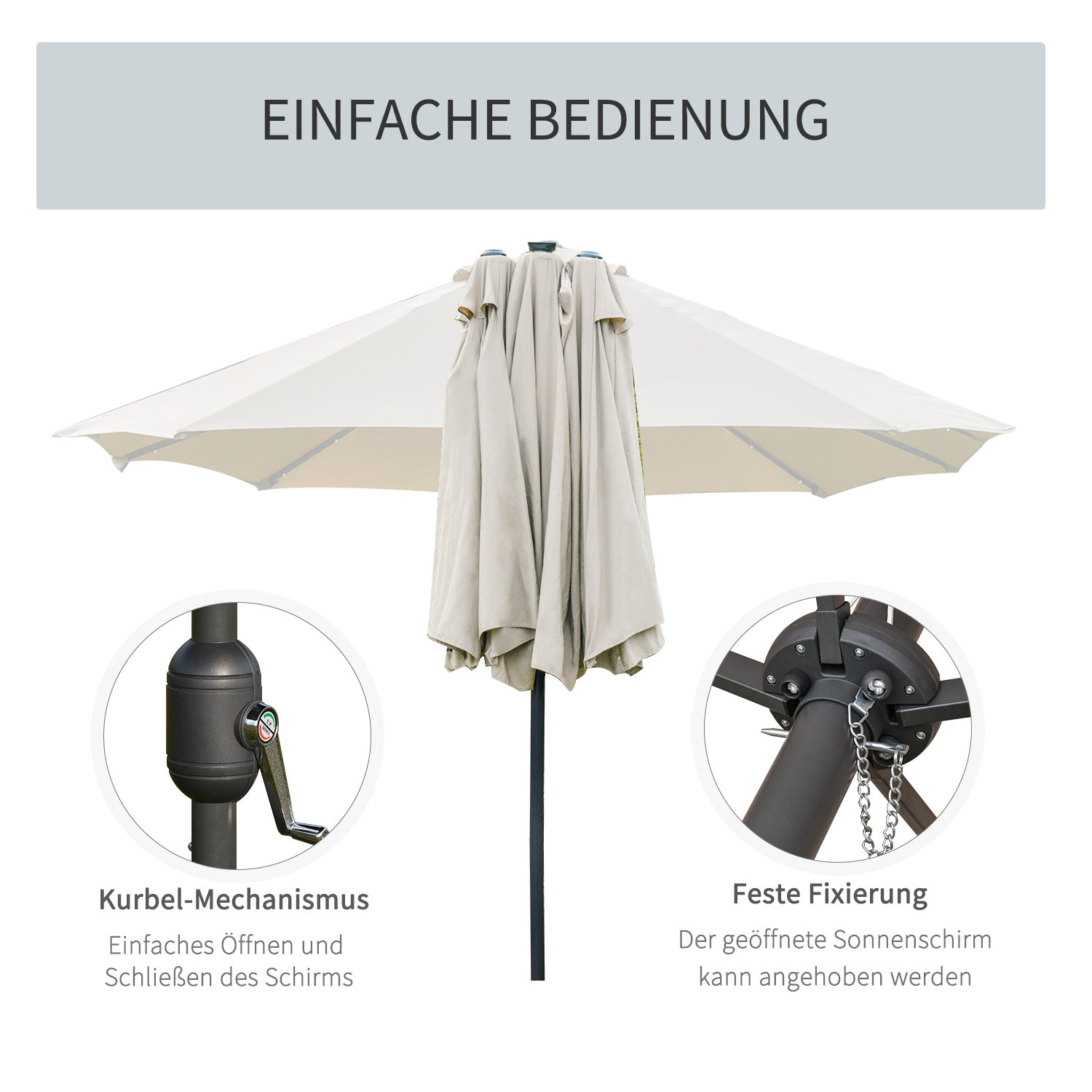 Lys din have eller terrasse op med denne smagfuldt designede dobbelte parasol! Den er udstyret med 36 LED-lys, der giver rigeligt lys til læsning eller andre hobbyer, selv i mørket. Om dagen beskytter den store parasol dig mod direkte sollys og skaber en hyggelig atmosfære i din have.
