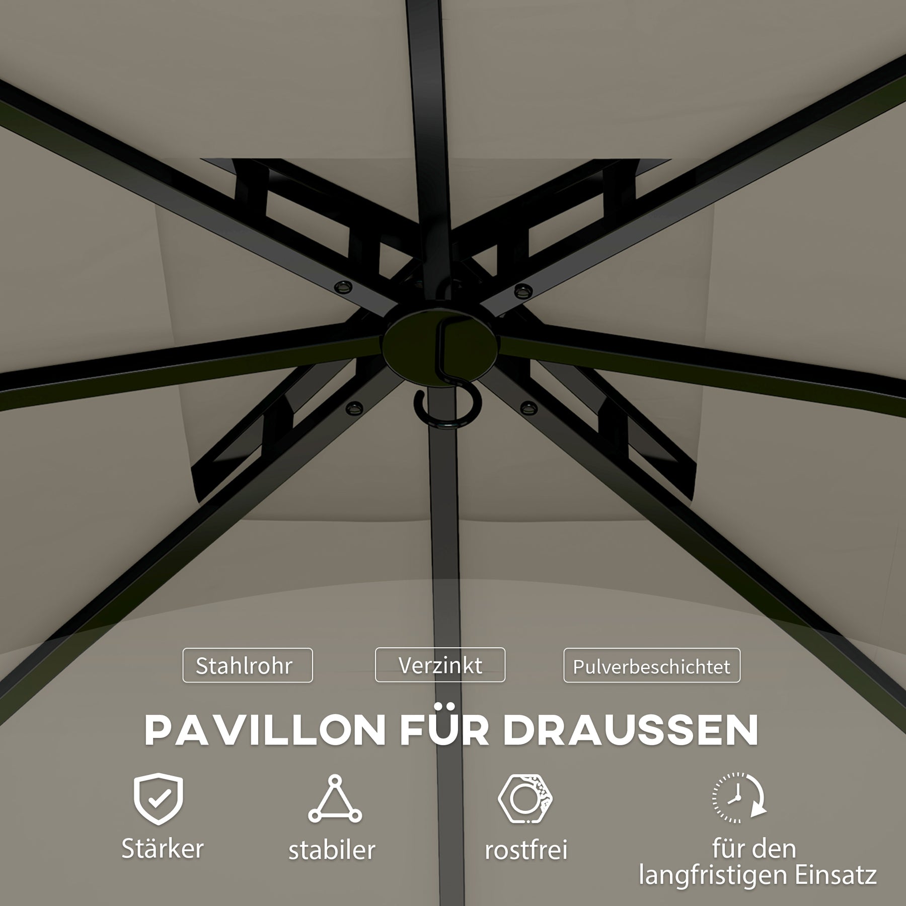 Oplev naturens magi under et elegant pavillon. Med et slidstærkt tag, der beskytter mod solen, og stilfulde, gennemsigtige buede vinduer, er dette pavillon ikke kun et blikfang, men også meget praktisk. Den robuste, pulverlakerede metalramme og det innovative to-lags tagdesign sikrer optimal luftcirkulation og beskytter dig mod elementerne - perfekt til terrasser, haver og andre udendørsområder.